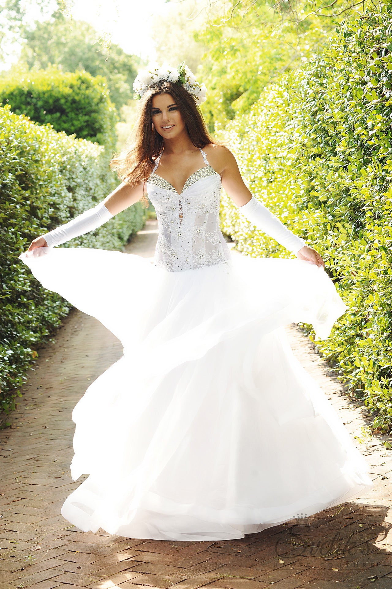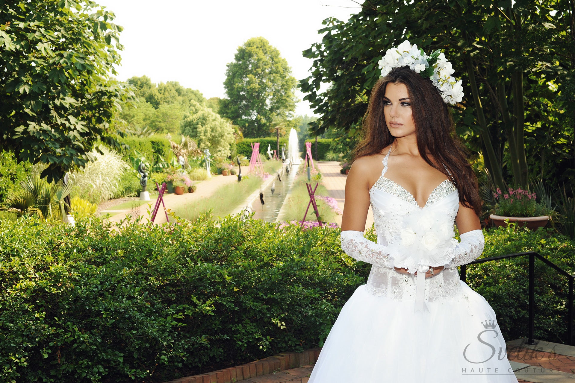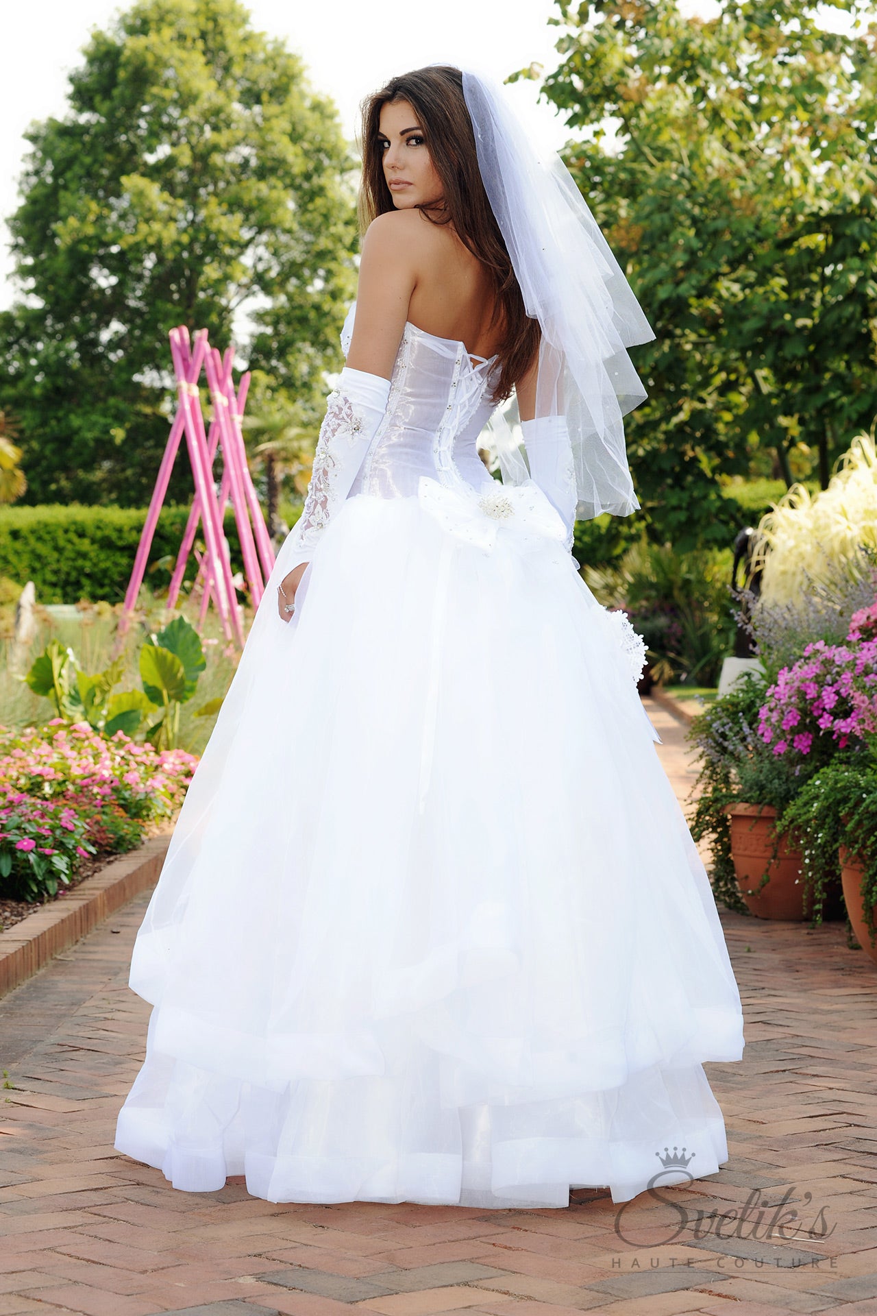 Daring and dramatic, soft and sultry – the Blooming Secret bridal gown by Svetik’s Haute Couture is a showstopper from start to finish, from its illusion corset bodice with plunging jeweled neckline to dramatic tiered skirt and train. Layers of sheer organza and silk satin skim the body’s curves in the fitted sheer corset bodice, featuring floral embroidered details sprinkled with Swarovski and Preciosa crystals and matching thin straps. A dramatic, fully layered skirt made of layers of luscious organza and European tulle cascade from the dropped waist, finishing off this work of art with all the dramatic flair worthy of the modern-day princess.