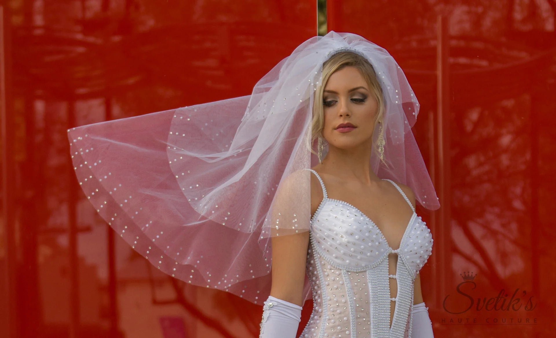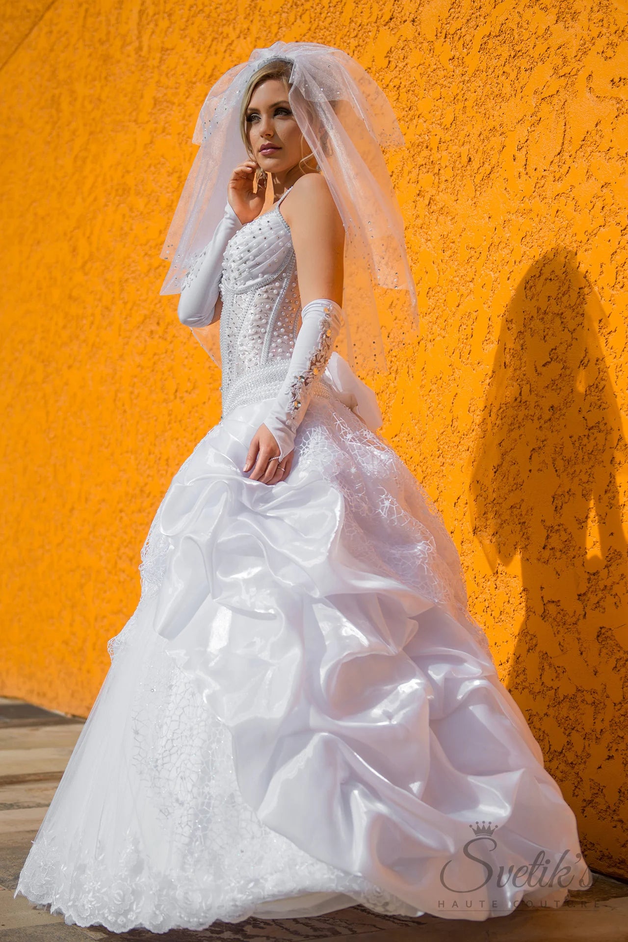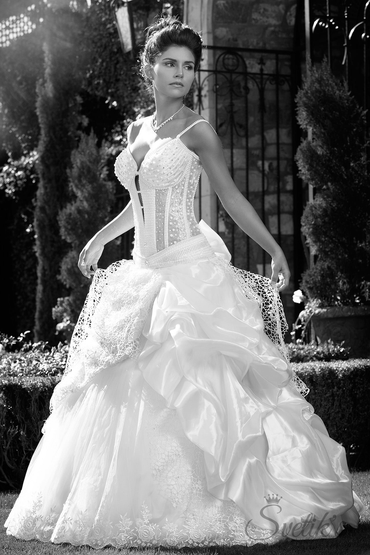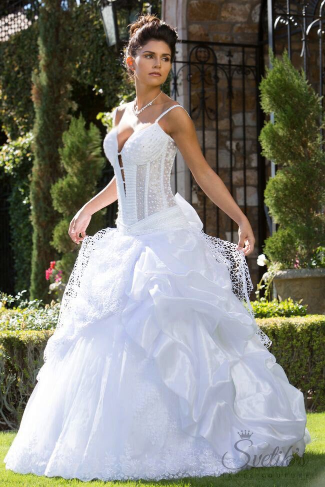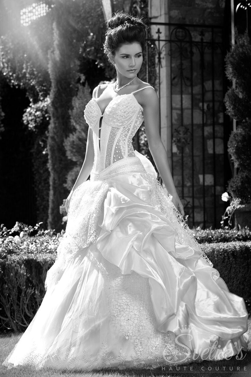 This stunning charmeuse satin and taffeta creation by Svetik’s Haute Couture features a plunging fitted bodice with molded cups and adjustable straps, coupled with a striking corset of translucent mirror organza embellished with a sprinkling of pearls and Preciosa crystals.