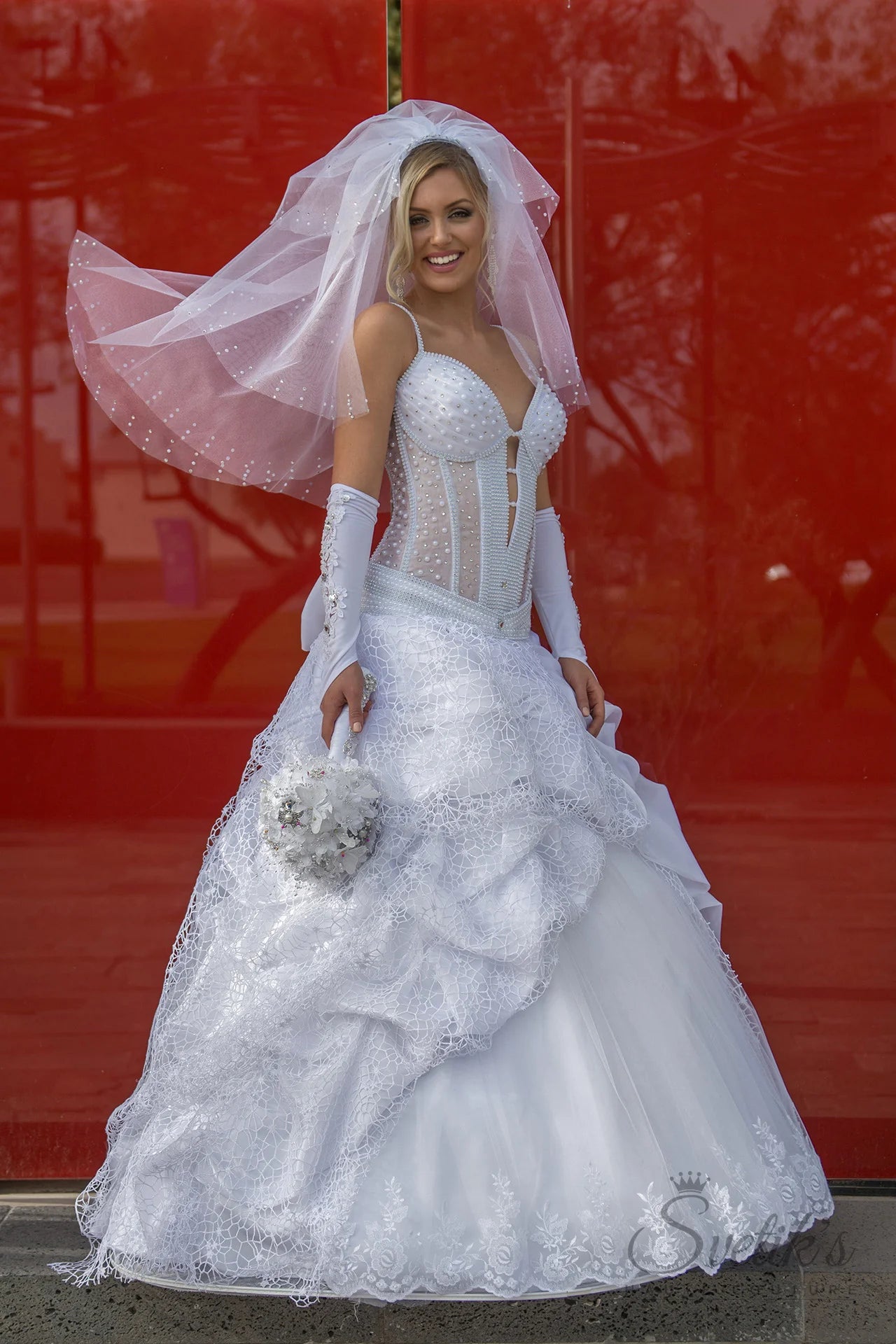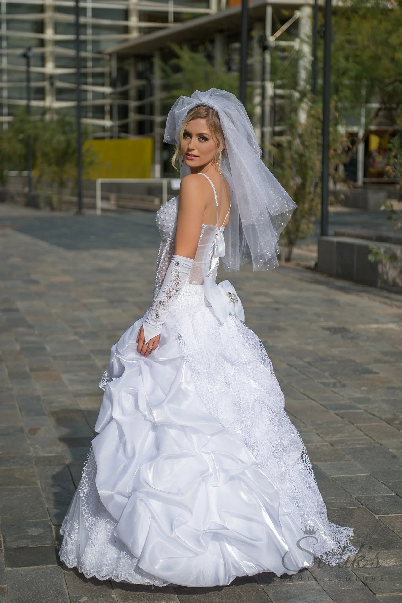 Four luxurious layers of organza, taffeta, and gathered satin cascade from the embellished drop waist into a full ball gown skirt with 40” train and overlay in delicate needle-point spiderweb lace.