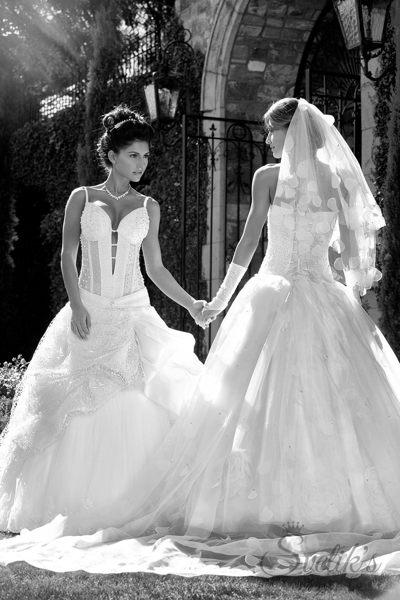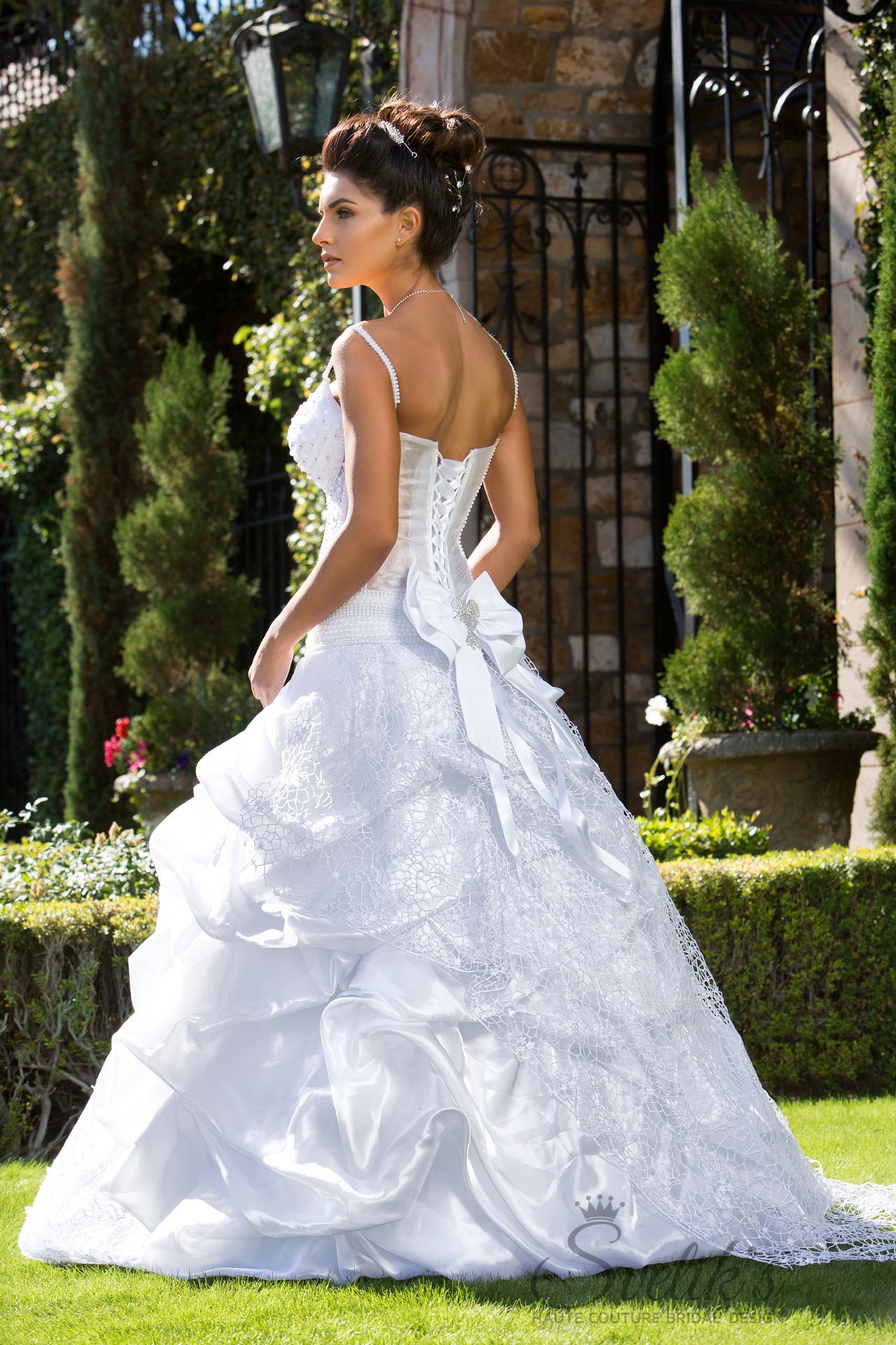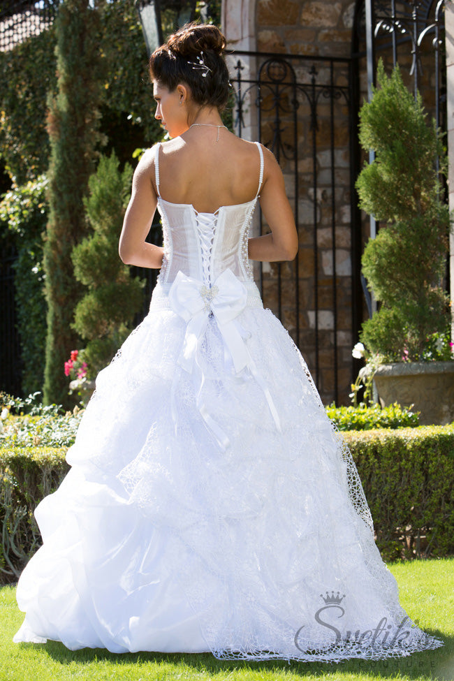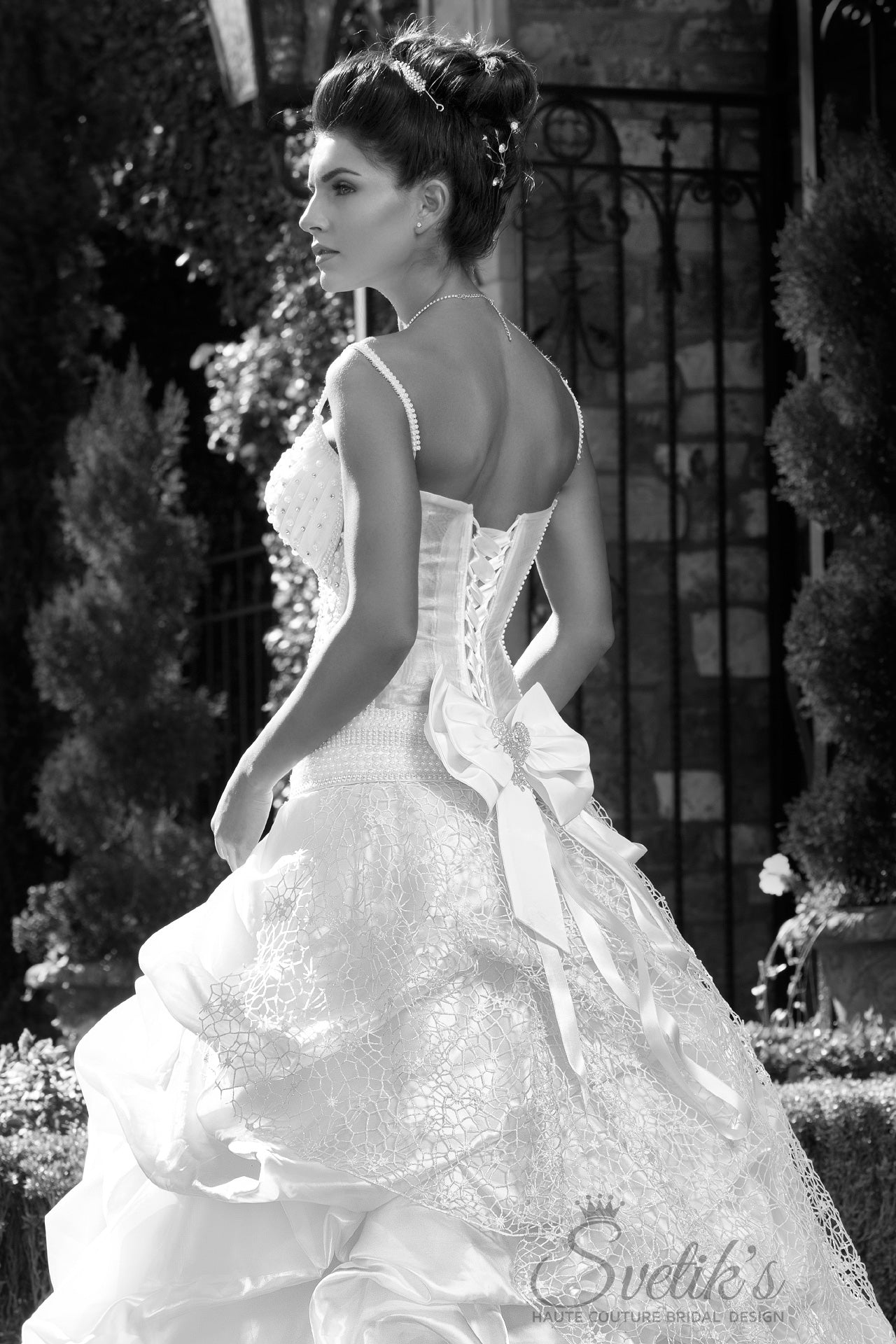 The always-romantic lace-up corset back and fitted waist are offset by a sumptuous handcrafted bow and the perfect finishing touch of a Bohemian crystal brooch.
