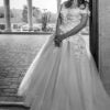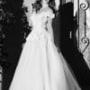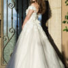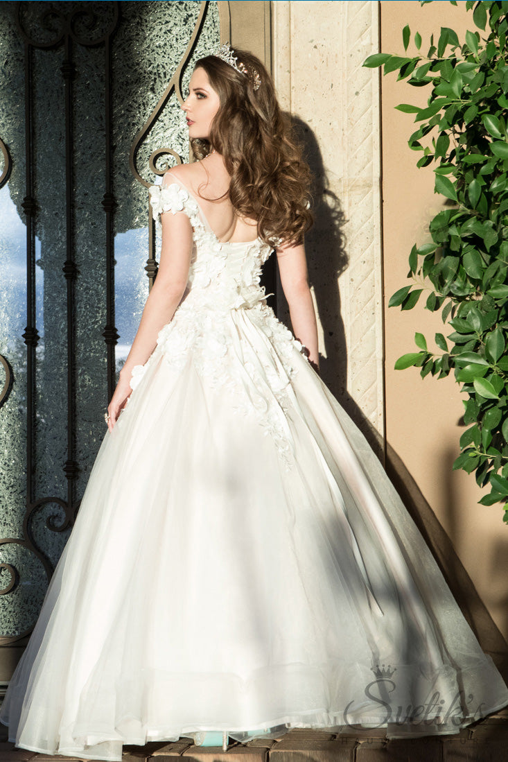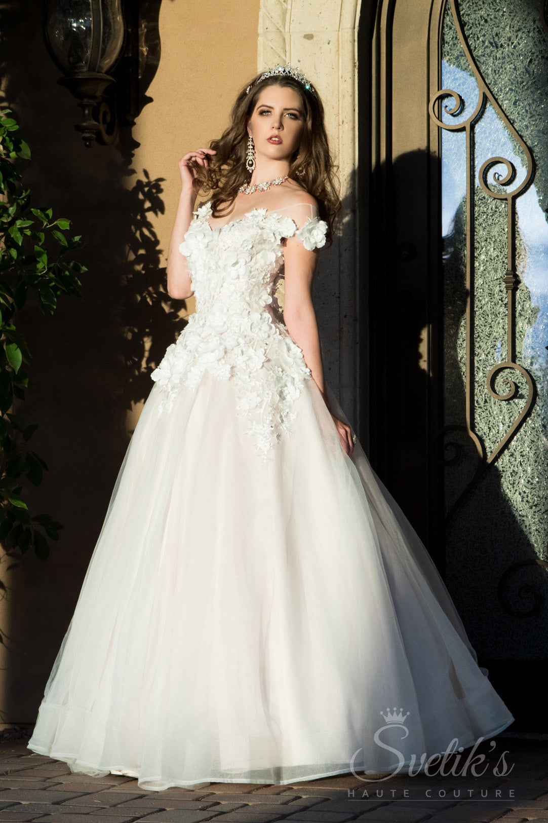 Dimensional floral lace forms a striking off-shoulder sweetheart bodice, cascading into a graduation of petals and flowers which end in a flowing, lightweight ball skirt made of luxurious French tulle.