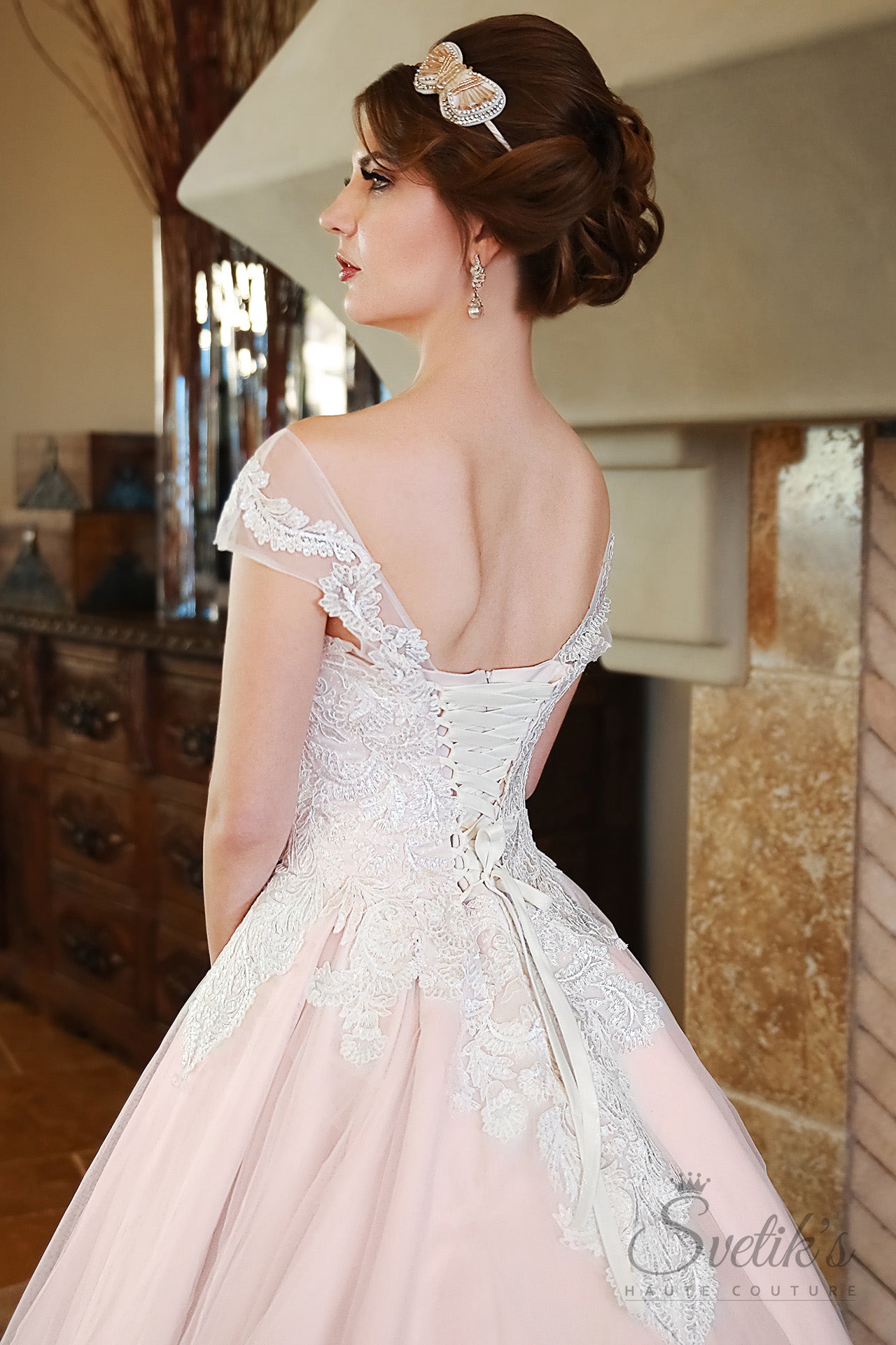 Delicate crystal beading and corded lace overlays lend a hand-worked touch to this stunning creation, and a grandiose 60” cathedral train and turns this gown into a true showstopper.