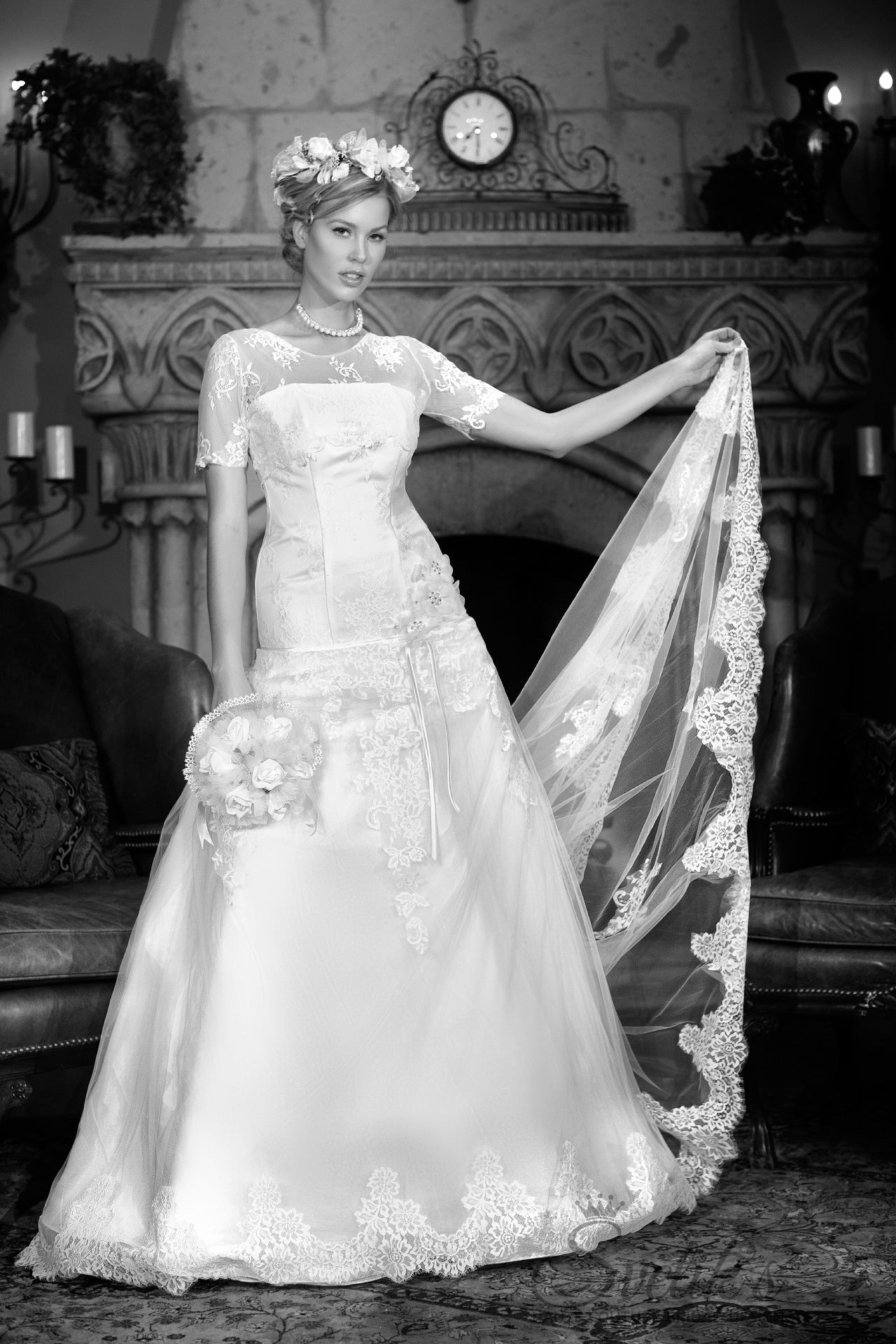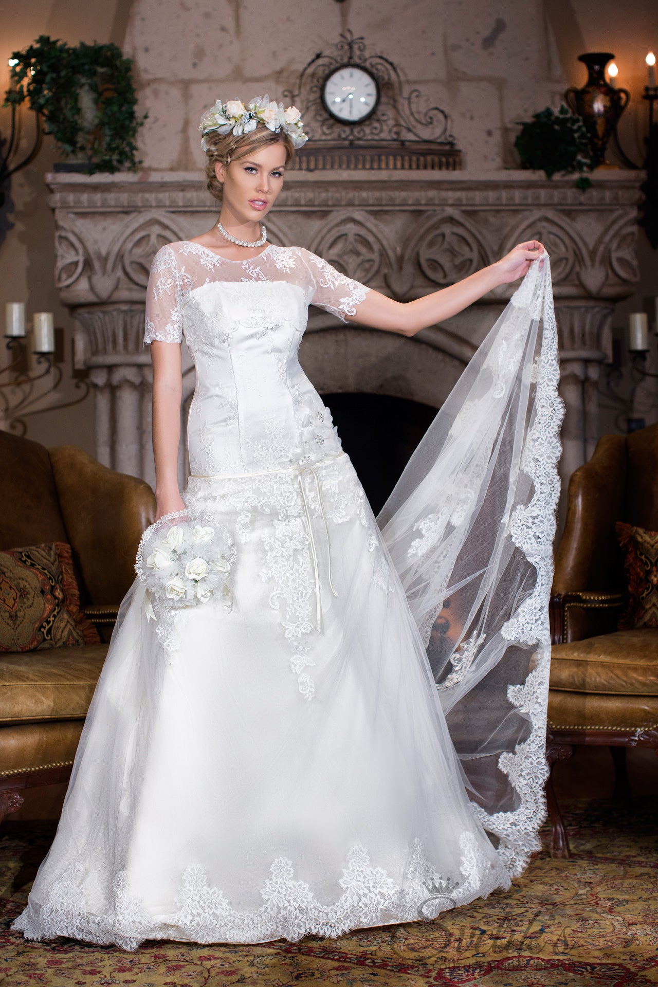 Sometimes, less is more – as evidenced in this breathtakingly delicate sweetheart gown handcrafted by Svetik’s Haute Couture. Exquisite silk satin and European tulle form a fitted, drop-waist bodice on this slimming ensemble, matched to a layered skirt and magnificent cathedral train trimmed in scalloped lace overlays. Delicate ribbon detailing, a slight scattering of Preciosa crystals, and hand-sewn silk floral details add a touch of love and romance into this carefully crafted gown, while the addition of a softly sophisticated illusion top with short sleeves updates the silhouette into a fashion-forward interpretation of the modern lace bridal gown. Made for the timeless and chic bride, this dress is nothing less than a work of art.