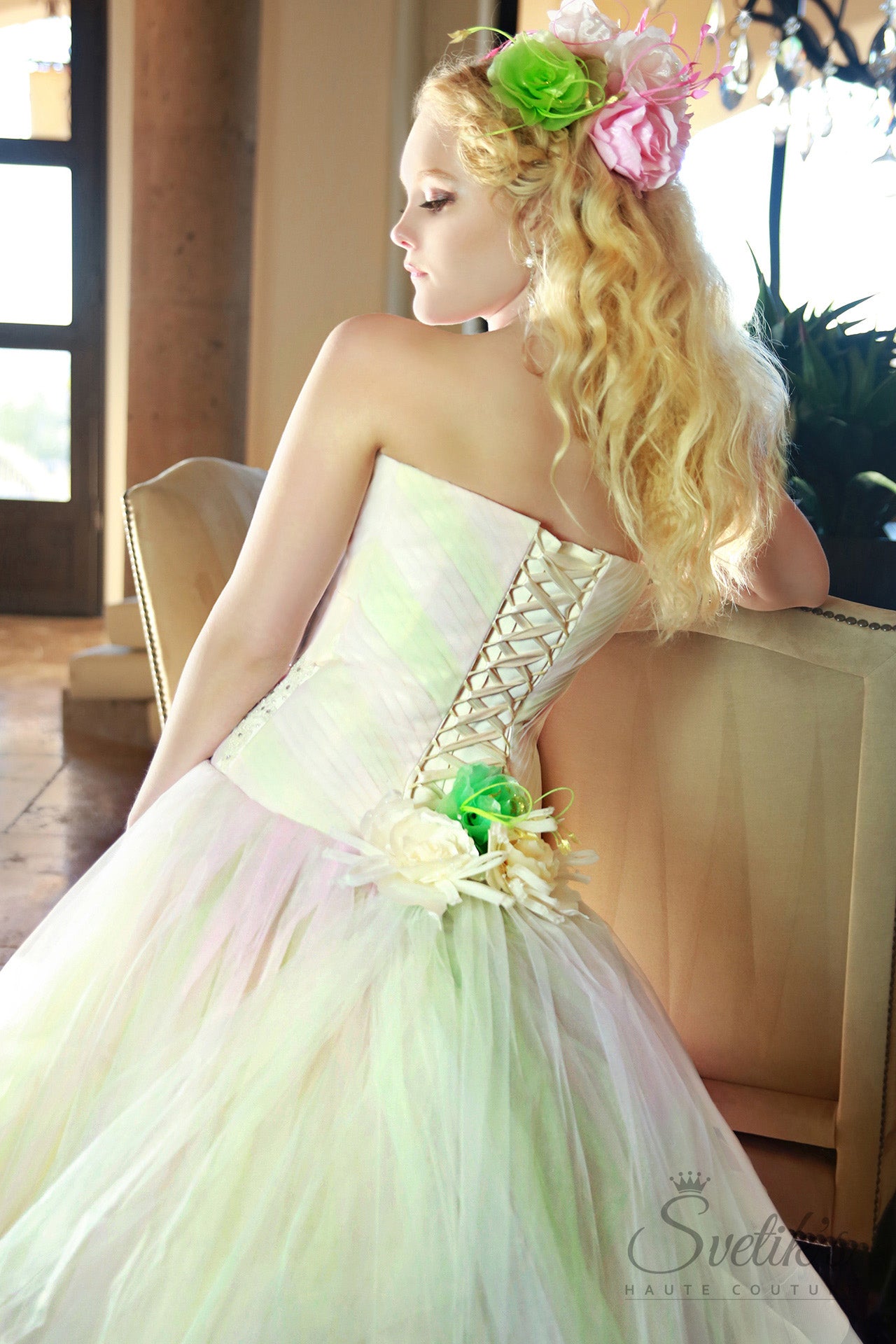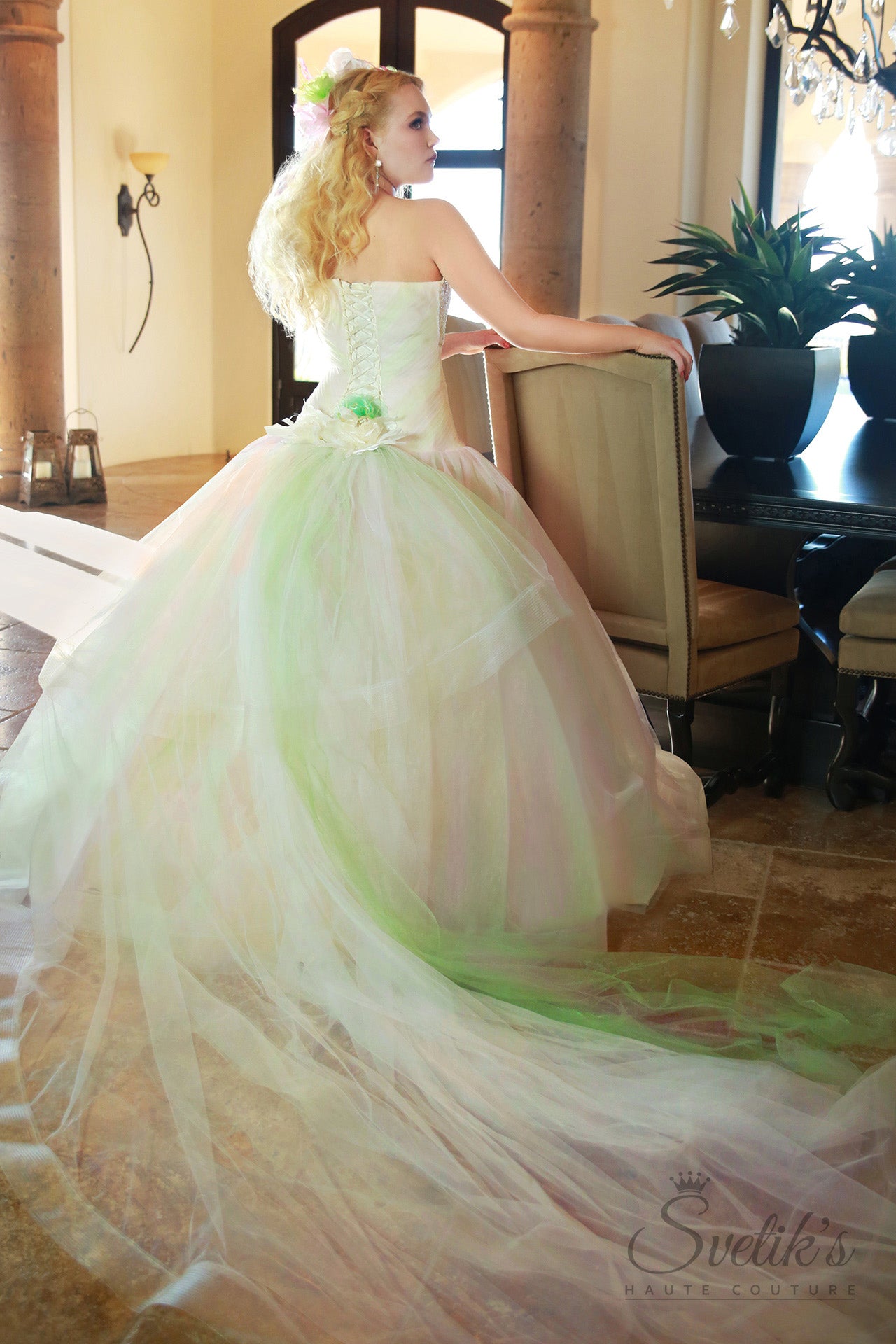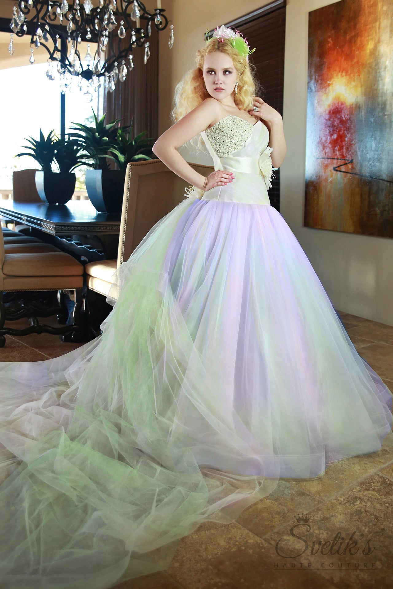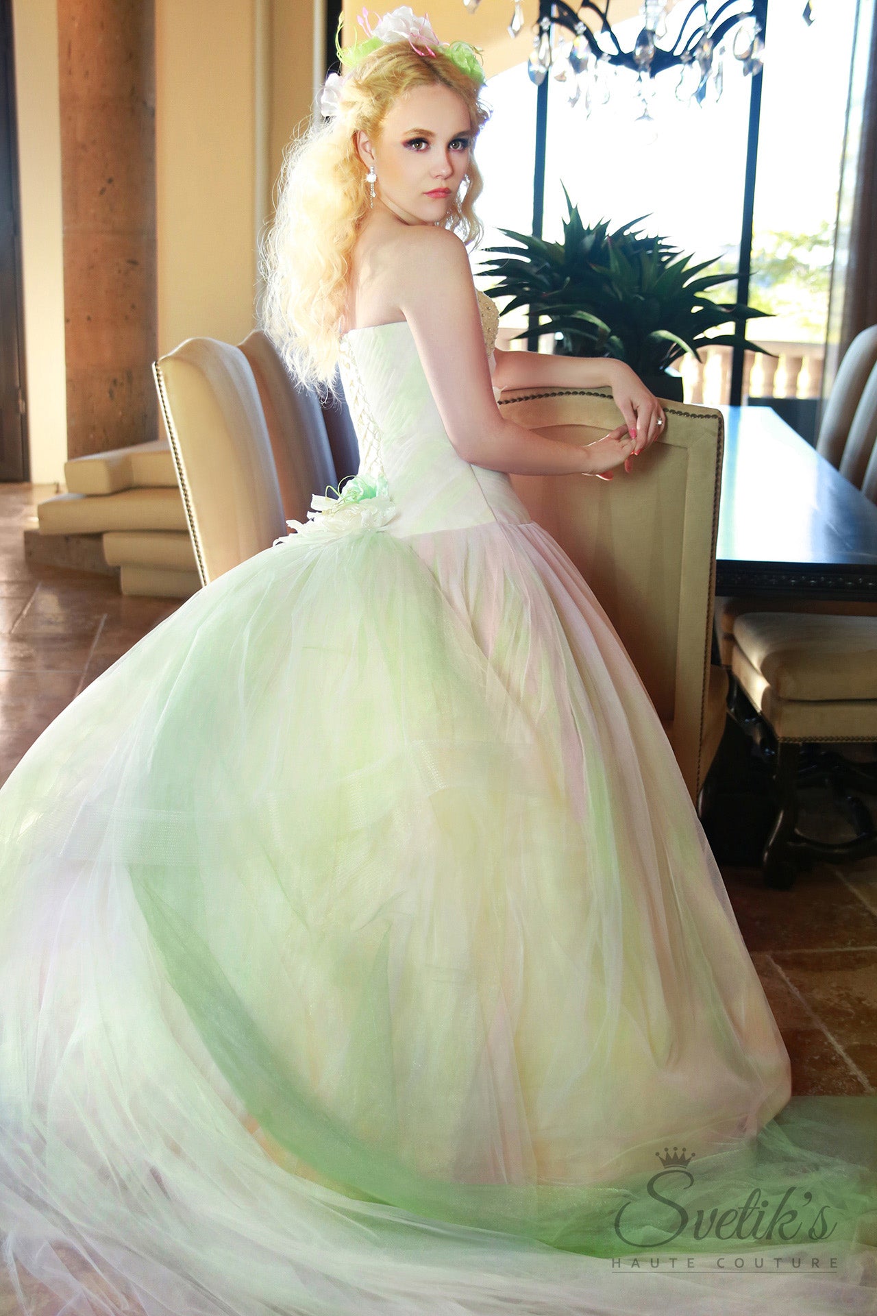 The full ball skirt floats away from the body in layer upon layer of luxury European tulle, light as a feather and softly romantic with its pastel colors and subtle edging detail.