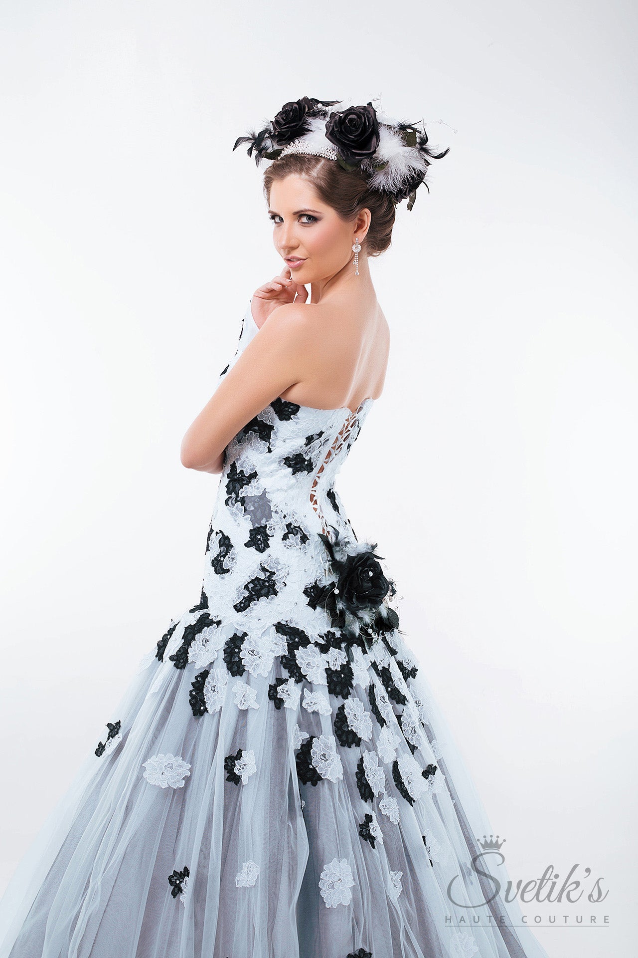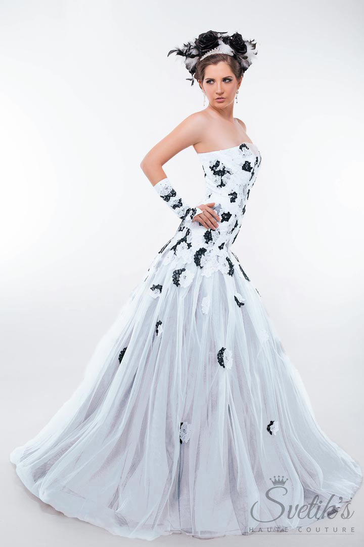 Dramatic and daring and just a bit quirky – if these words describe you, then the high-fashion Playful Gardenia gown is the perfect choice for your modern wedding. Striking contrasts of black and white tulle form a uniquely shaded skirt, topped with a cascade of black and white floral lace applique that attracts every eye immediately to the most important person in the room. The sweetheart bodice features a slightly dropped waist for perfect fit, and a scattering of Swarovski crystals adds a finishing touch of sparkle to the contrasting florals. A daring lace-up back and dimensional black flower detail along with matching black-and-white elbow gloves make this look one that your party will be talking about for weeks to come.