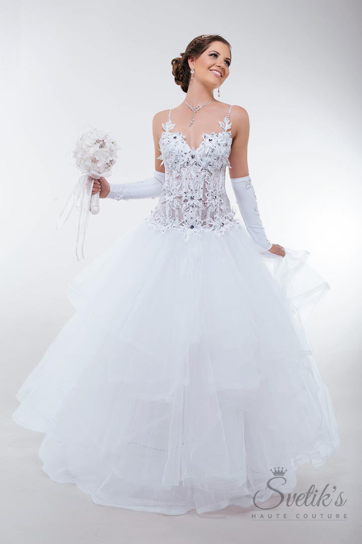With its spaghetti-strapped sweetheart neckline and lightweight layered skirt, this form-fitting gown engages the eye with sparkling Swarovski crystal embellishments and the addition of custom elbow gloves.