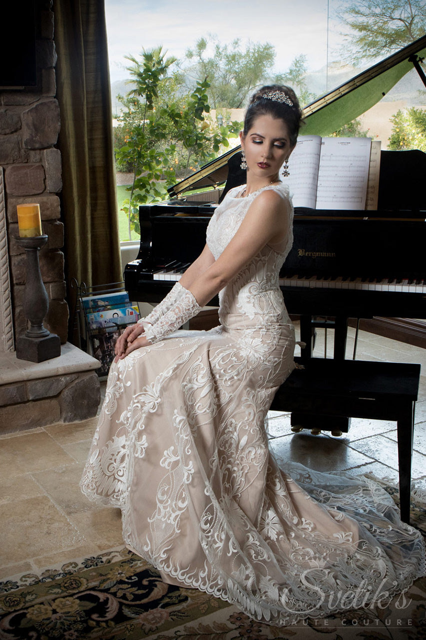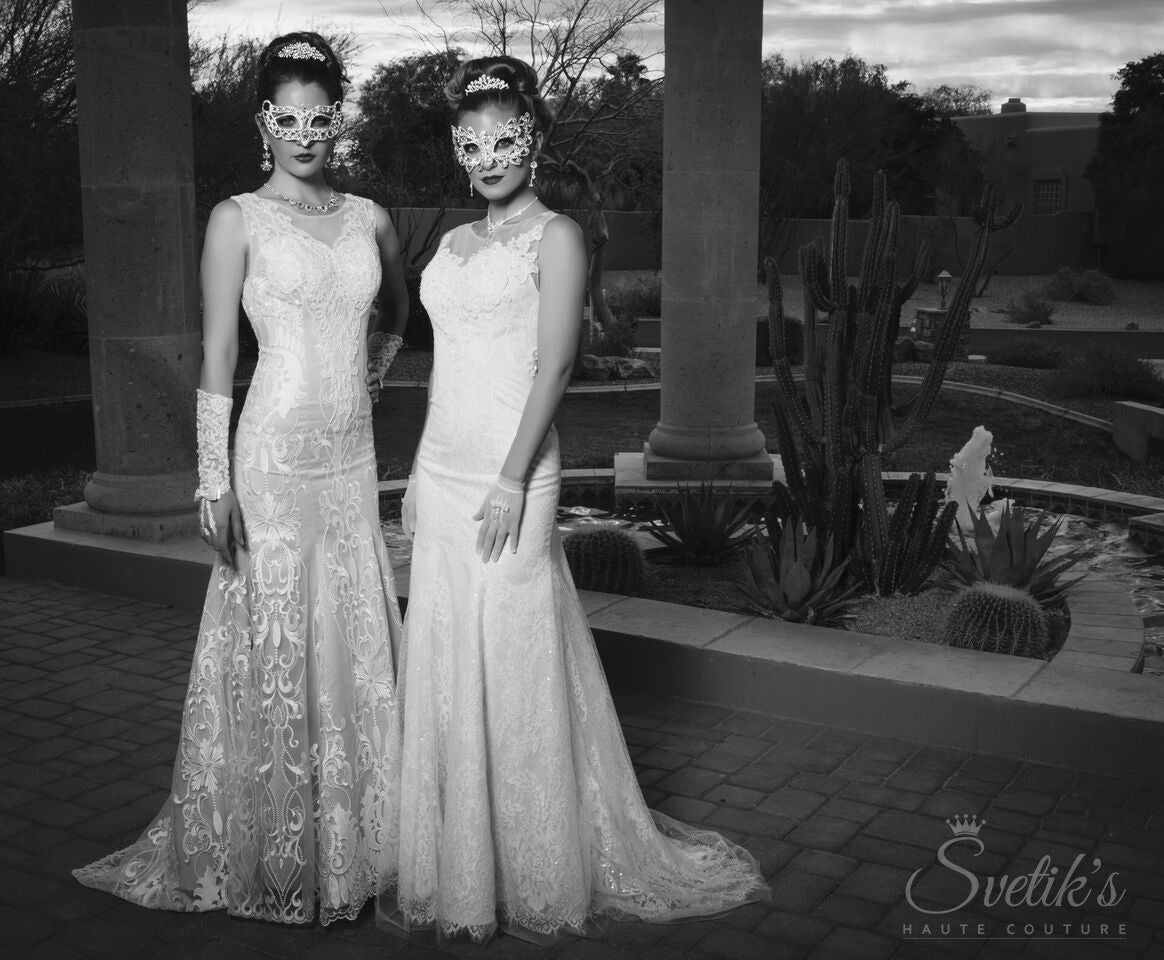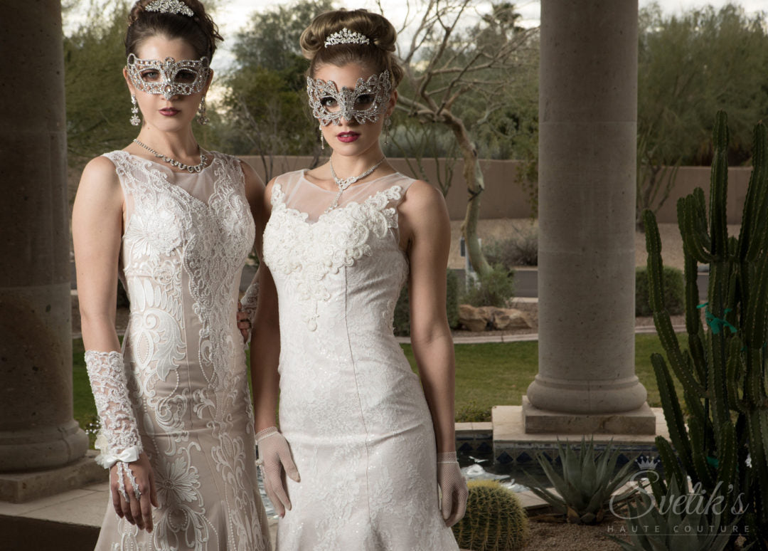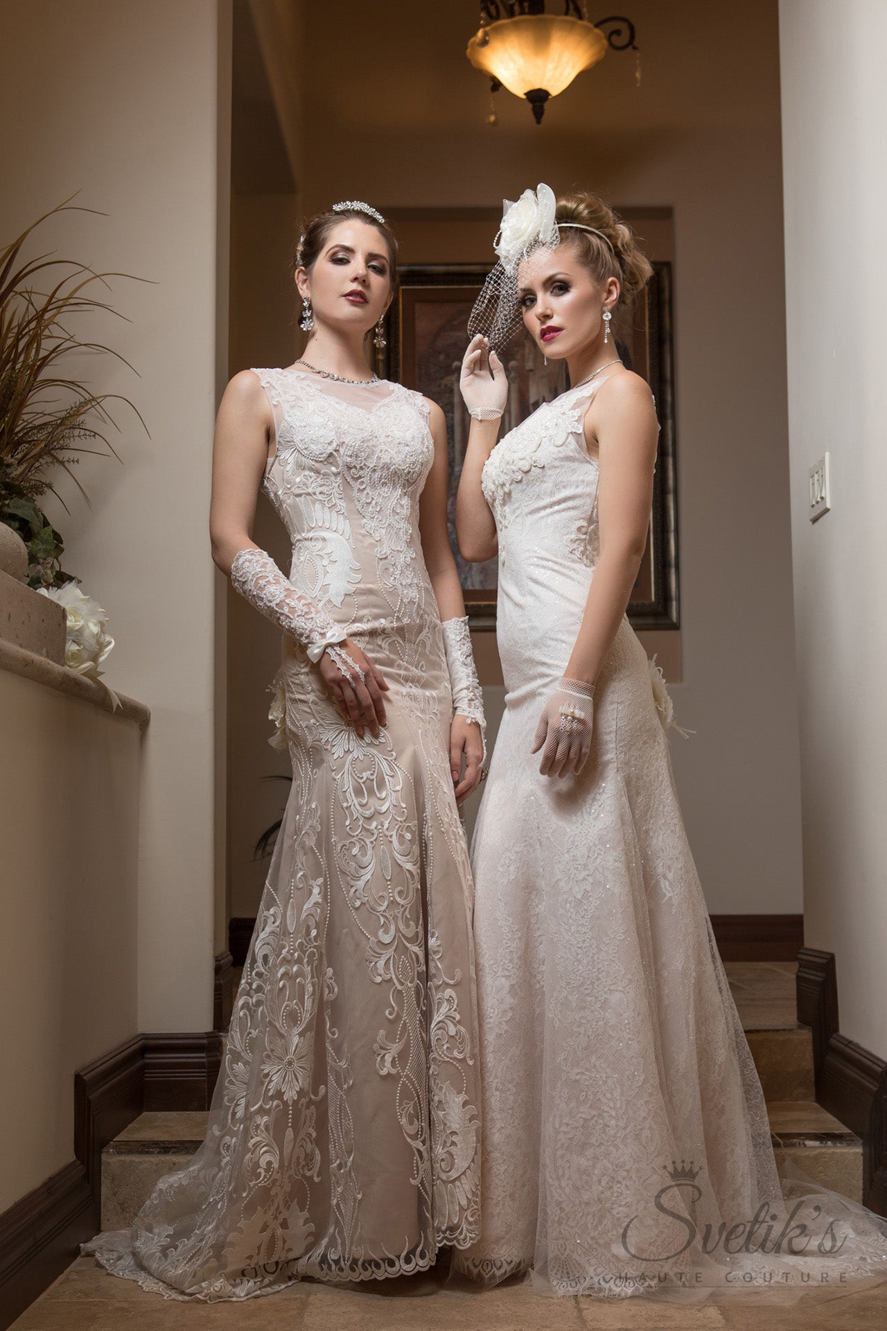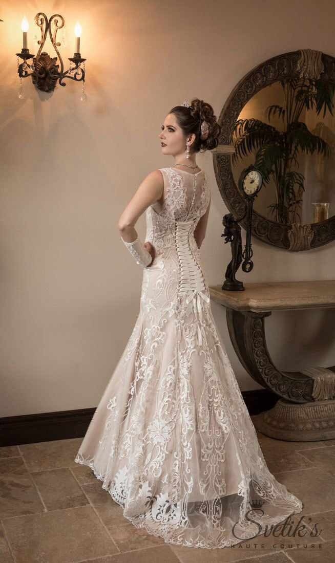 Sheer elegance defines this stunning lace illusion gown by Svetik’s Haute Couture. Sculpted from luxurious French tulle and Venetian beaded lace, this sleek sheath gown features a deep V-neck and intricate embroidered lace straps, with a button-up illusion back cascading into a figure-flattering, fully-adjustable corset. Embroidered, beaded lace swoops around the body in breathtakingly romantic patterns, cascading into a scalloped-edge skirt with 40” train.