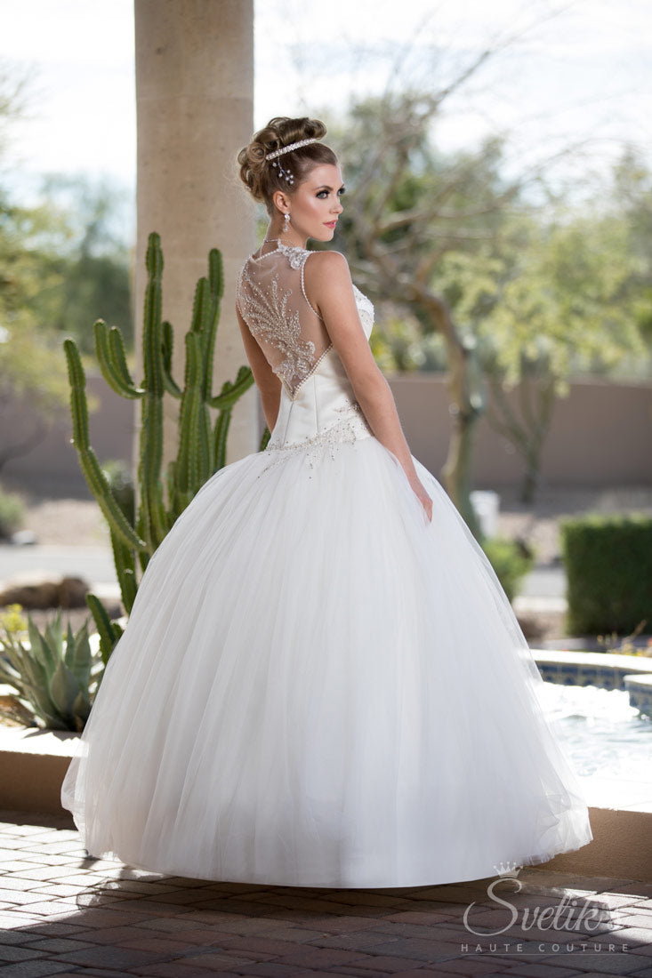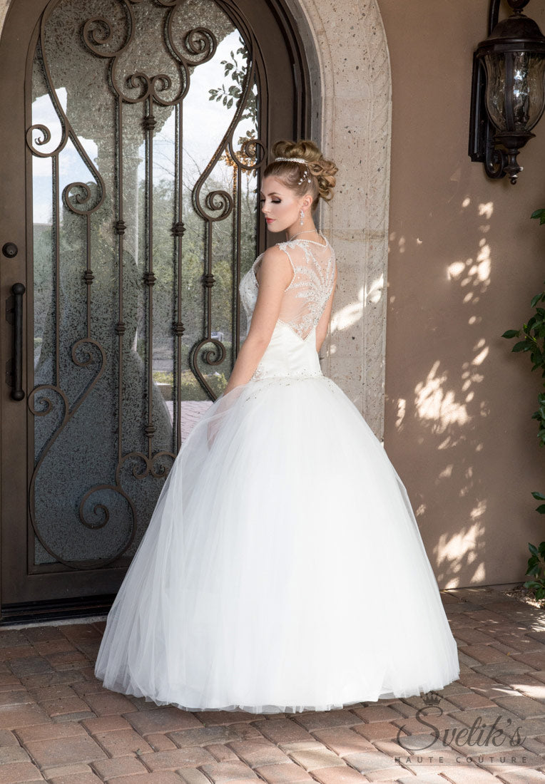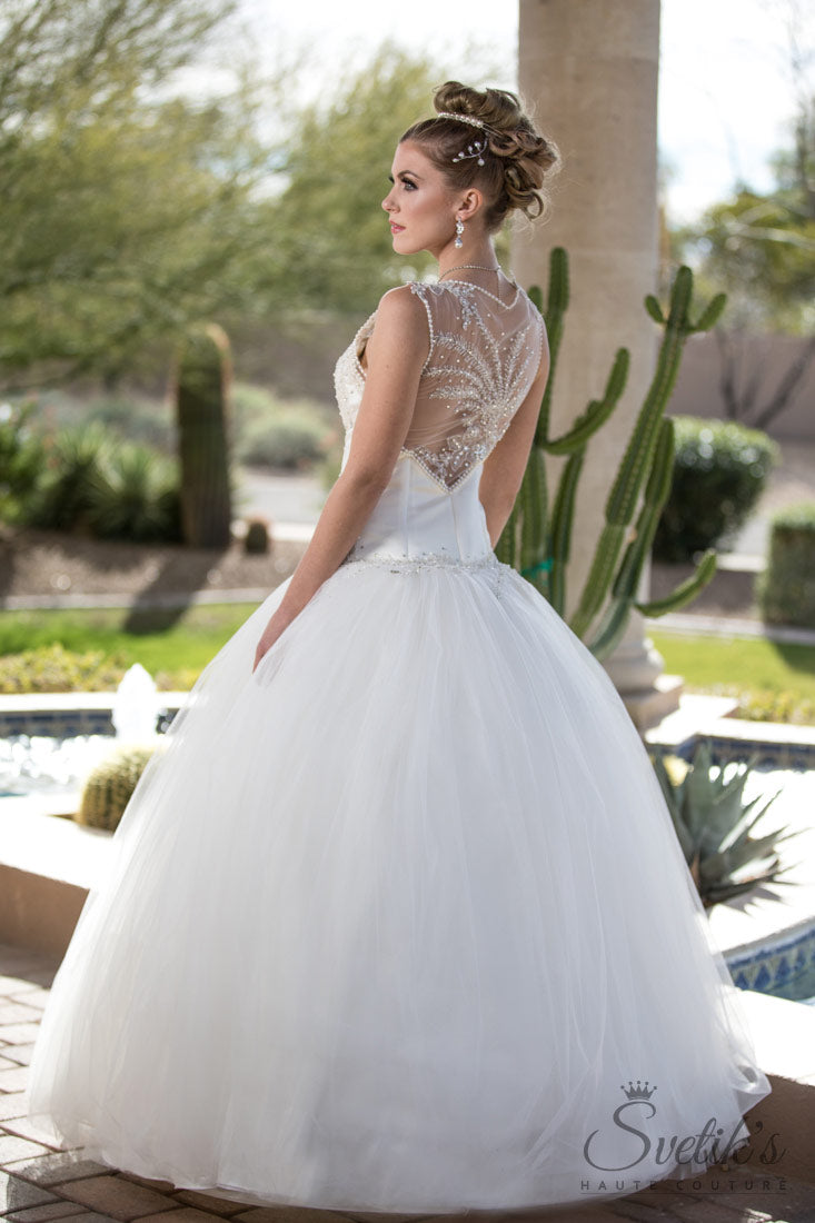 Fashion-forward and alluring, this gown brings all the drama with asymmetrical embellished straps and a full skirt made of lightweight European tulle.