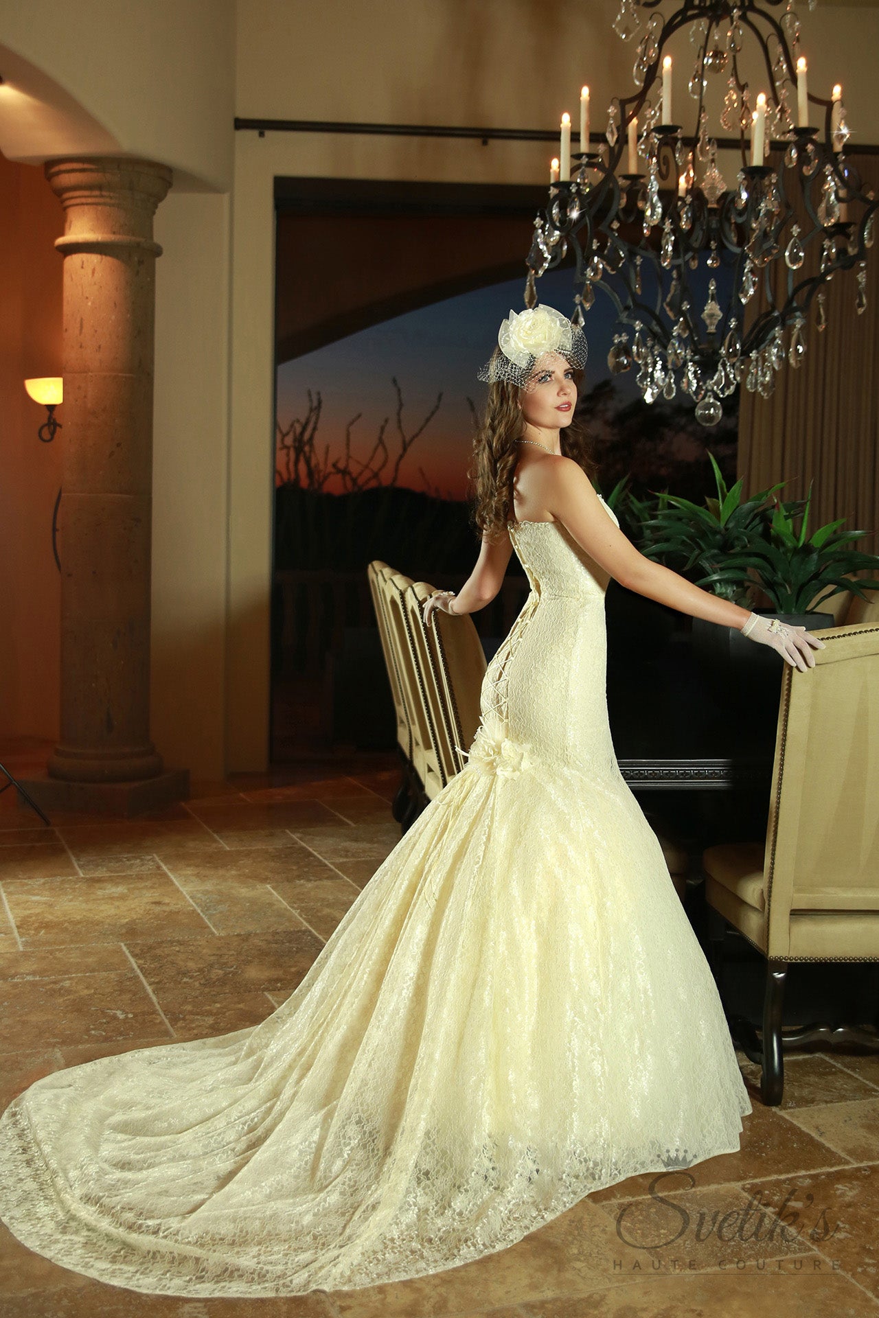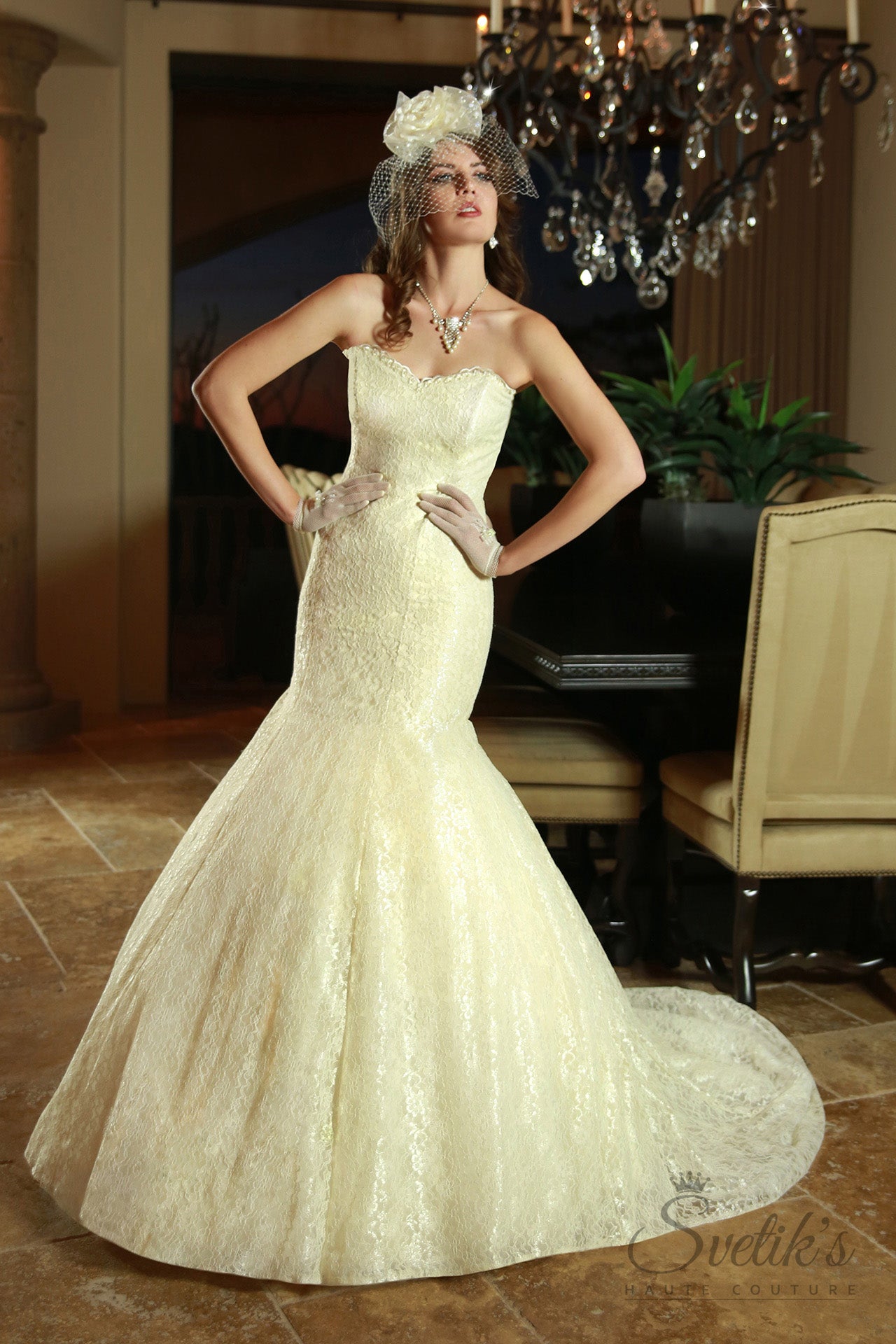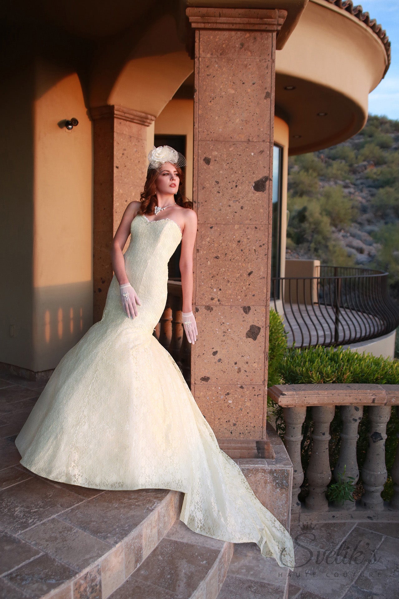 Svetik’s Haute Couture brings art to life with The Fairytale, a modern twist on the classic lace trumpet sweetheart gown.