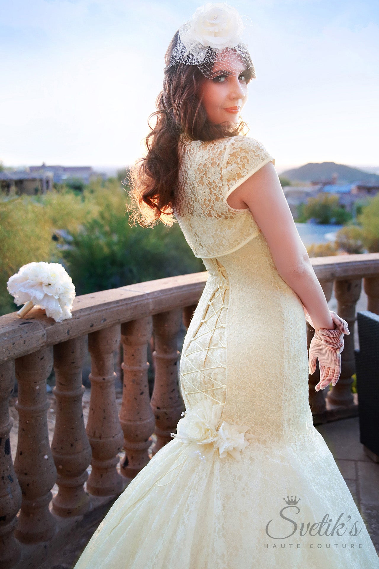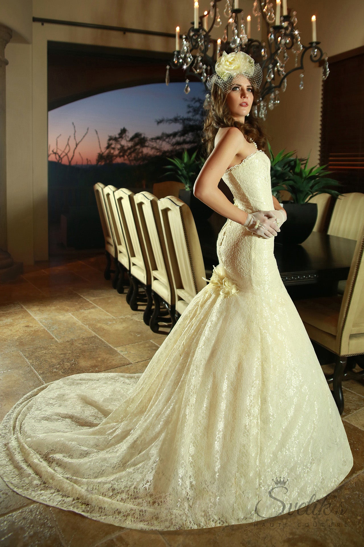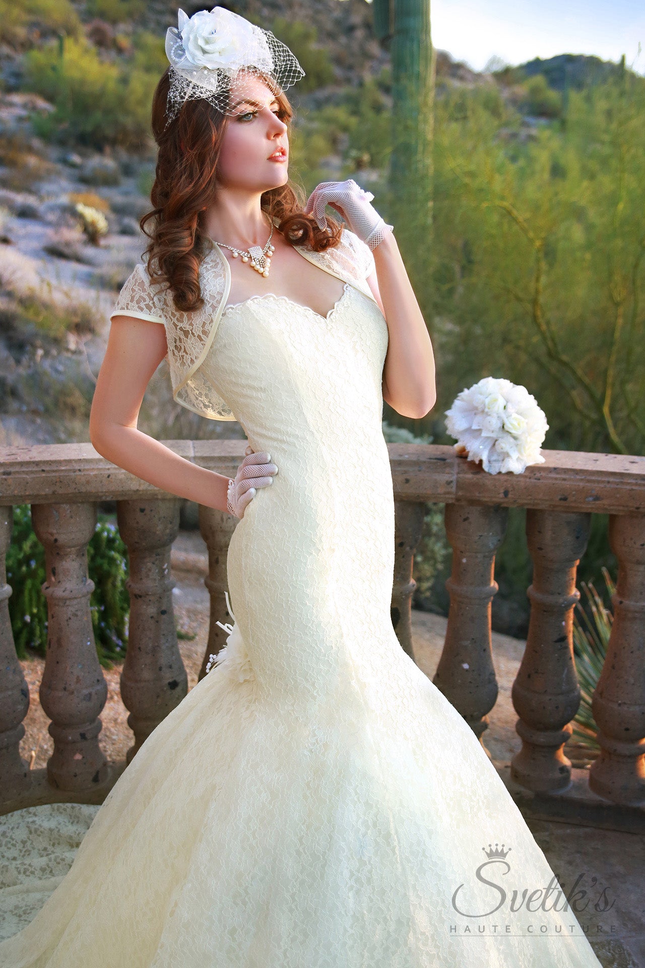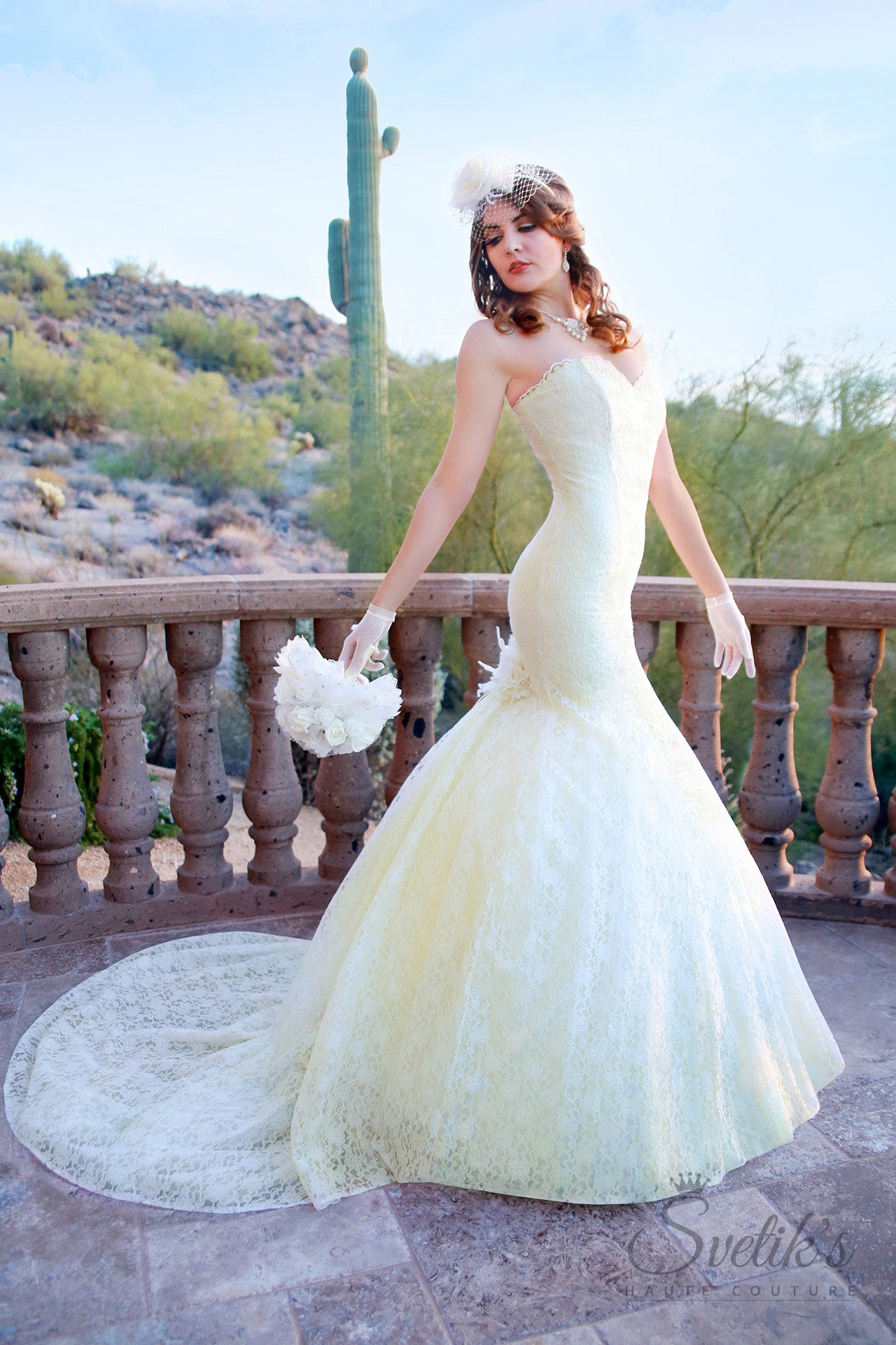 Svetik’s Haute Couture brings art to life with The Fairytale, a modern twist on the classic lace trumpet sweetheart gown.