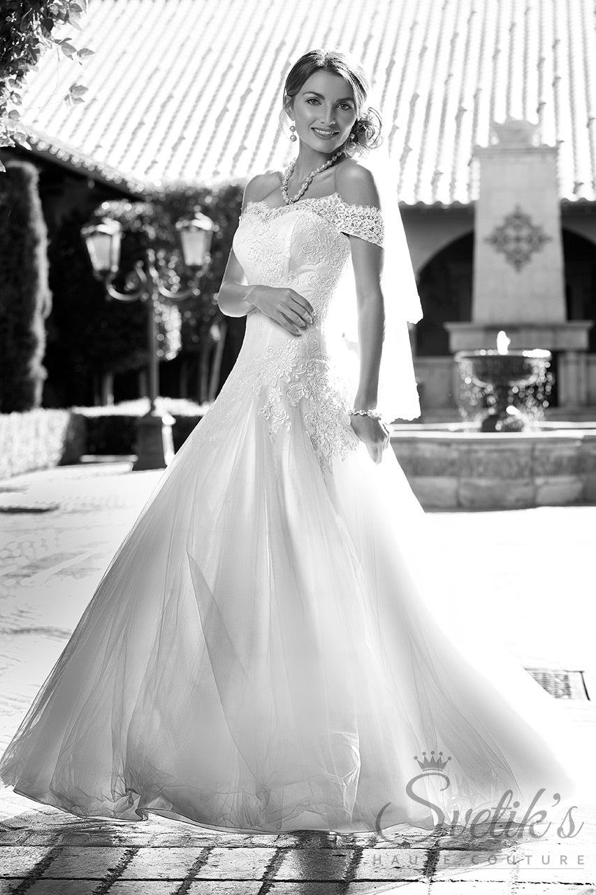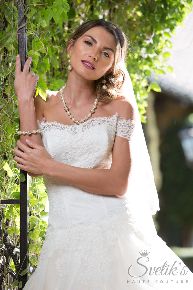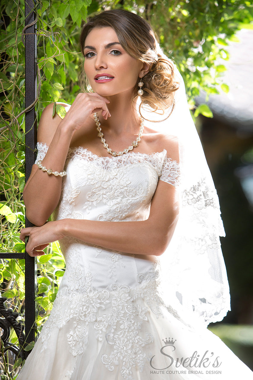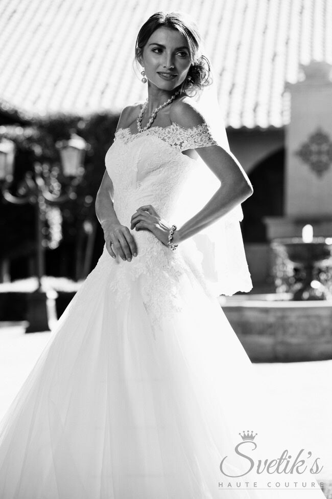 A modern take on the ball gown, the Lana lace gown by Svetik’s Haute Couture is a chic and sophisticated update to this classic silhouette. A less grand but no less breathtaking layered skirt of luxury silk satin and tulle float away from the body in the full A-line skirt of this gorgeous creation, just brushing the floor with a light chapel train. The close-fitting bodice features a modified dropped waist with cascading corded lace appliqué, carefully hand-placed for the perfect artistic effect. Off-shoulder lace sleeves add a fashion-forward element to this classic silhouette, making it a definite showstopper for the modern bride. Shown here in Vanilla Ivory.