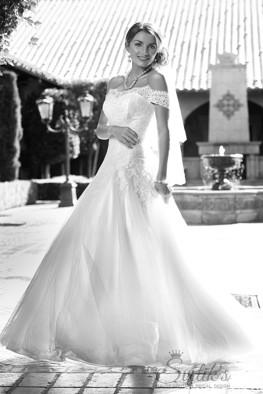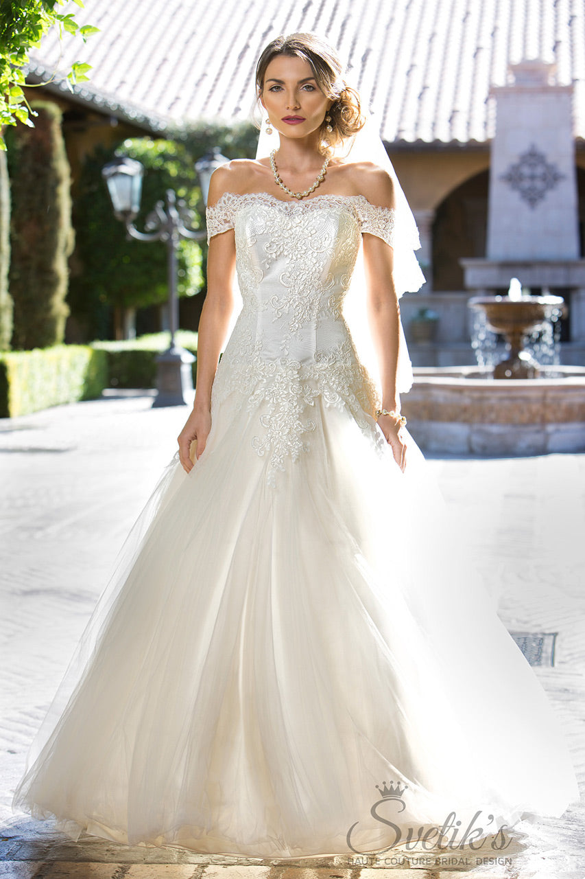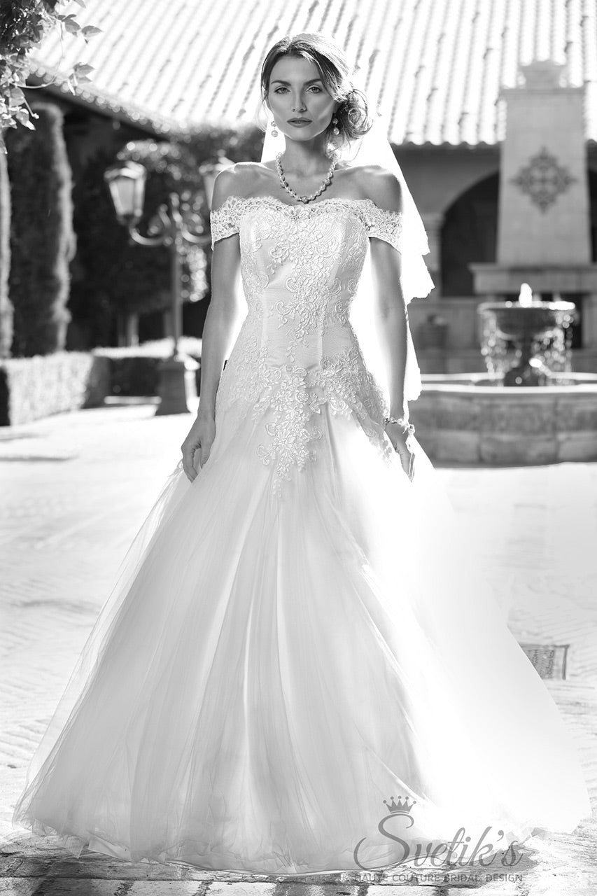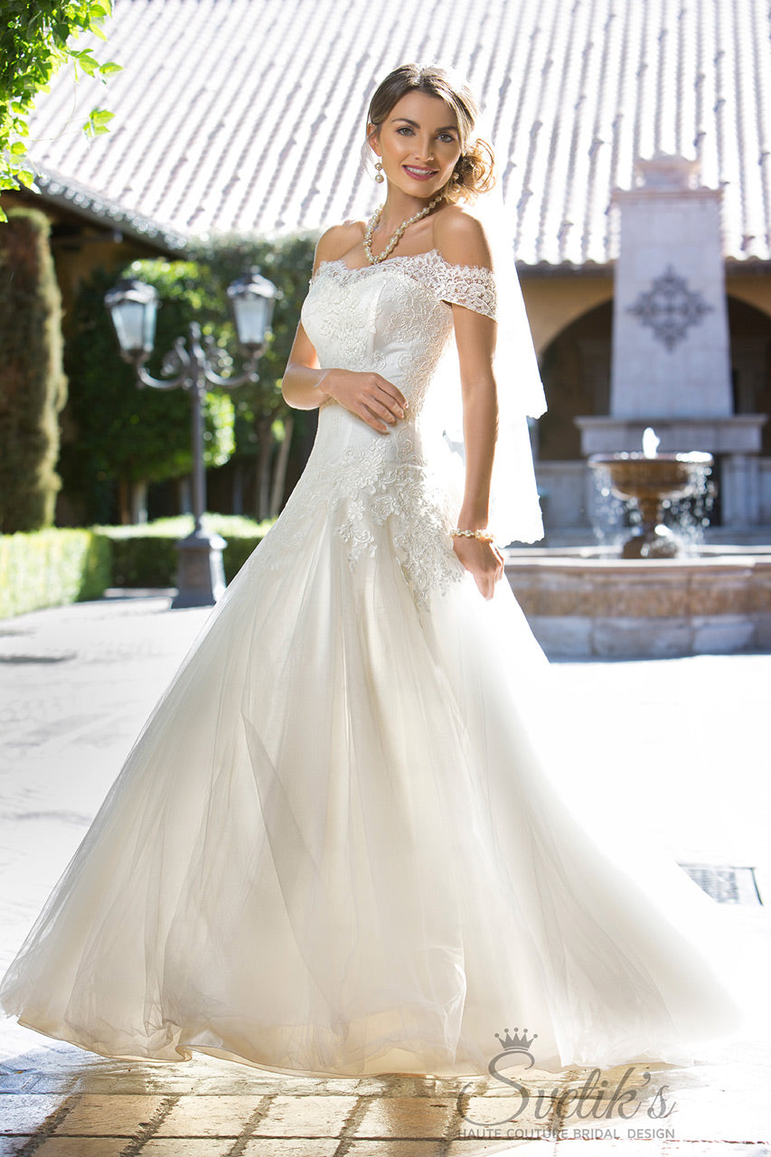 A modern take on the ball gown, the Lana lace gown by Svetik’s Haute Couture is a chic and sophisticated update to this classic silhouette. A less grand but no less breathtaking layered skirt of luxury silk satin and tulle float away from the body in the full A-line skirt of this gorgeous creation, just brushing the floor with a light chapel train. The close-fitting bodice features a modified dropped waist with cascading corded lace appliqué, carefully hand-placed for the perfect artistic effect. Off-shoulder lace sleeves add a fashion-forward element to this classic silhouette, making it a definite showstopper for the modern bride. Shown here in Vanilla Ivory.