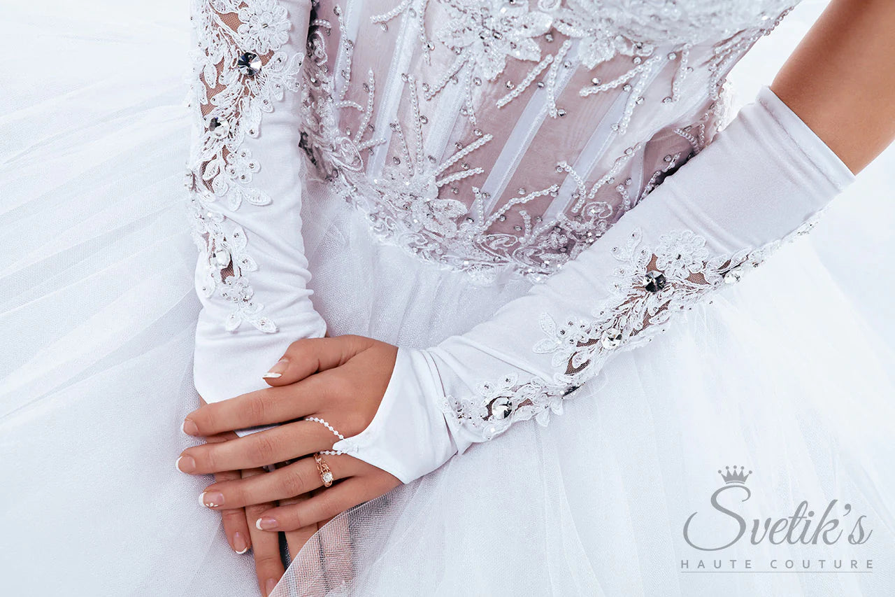 The finishing touch: custom-made three-quarter satin gloves with lace and crystal applique, the ultimate finis for a look that is picture-perfect.