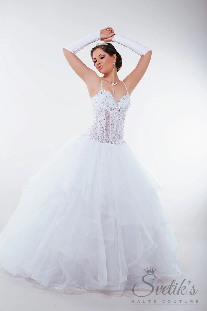 The Waking Beauty gown immediately captures the eye with its striking molded bodice and embellished straps. Fully adjustable up to two sizes, the lined corset glistens and sparkles with every movement on the dance floor and off, glittering with a sprinkling of Swarovski and Preciosa crystals and hand-sewn pearls, and delighting all with the surprise of a crystal-accented custom bow detail at the back.