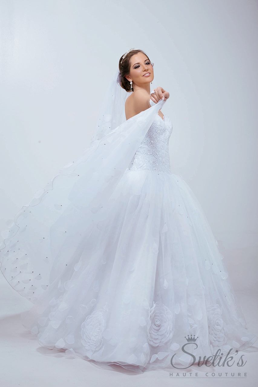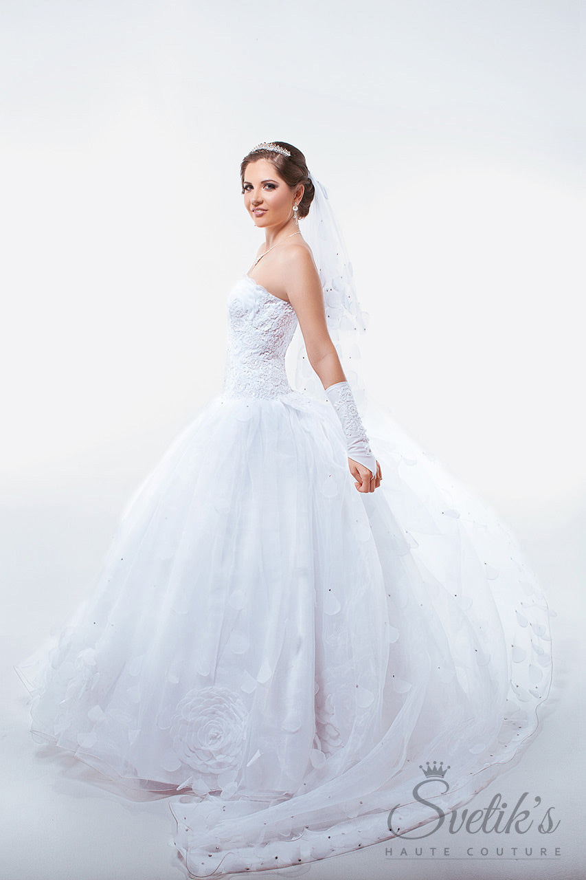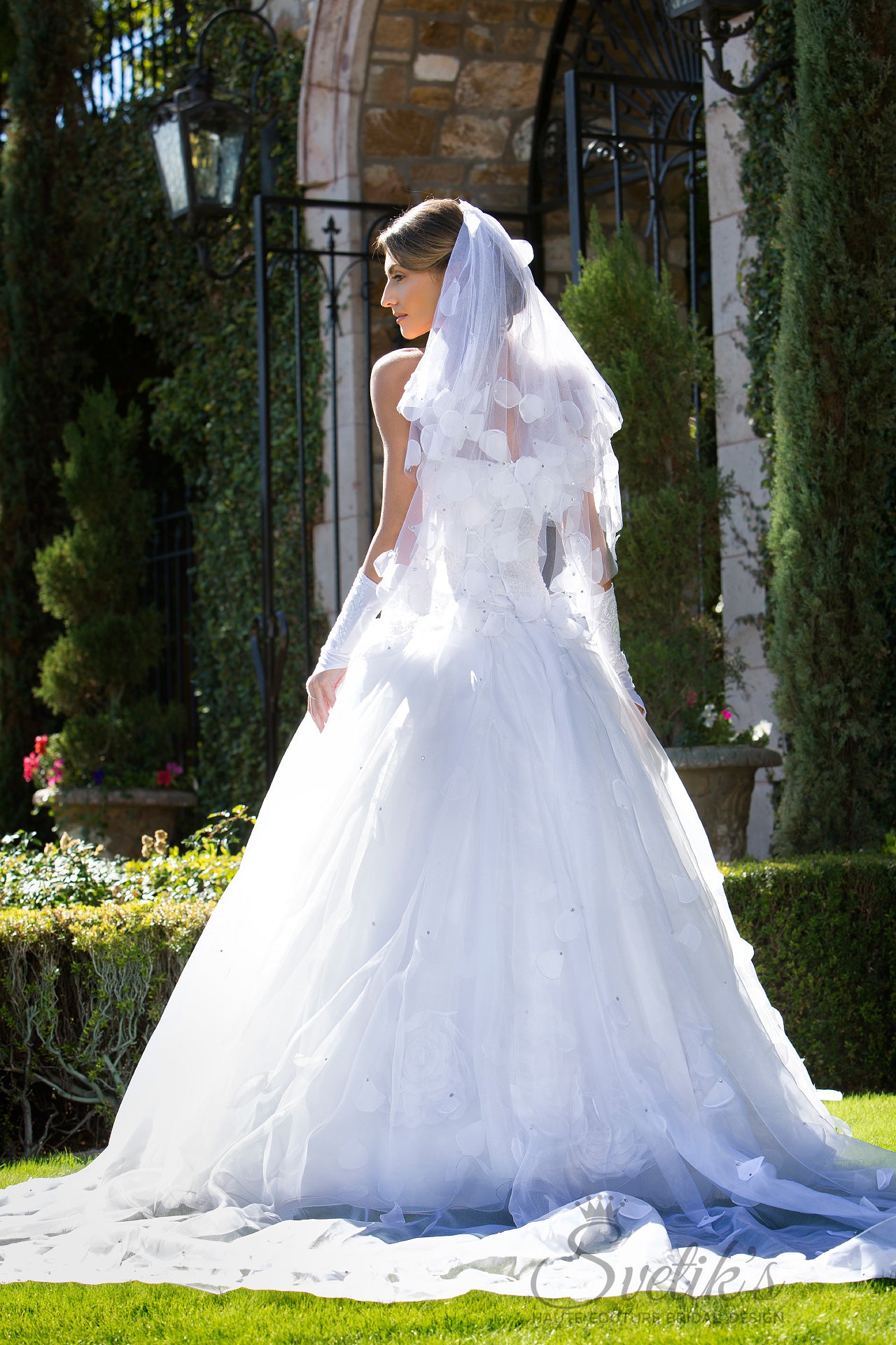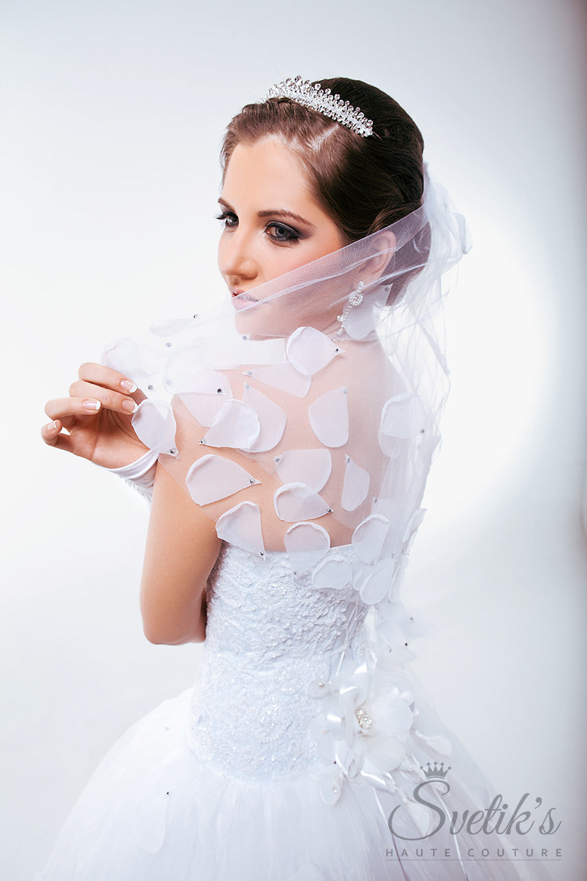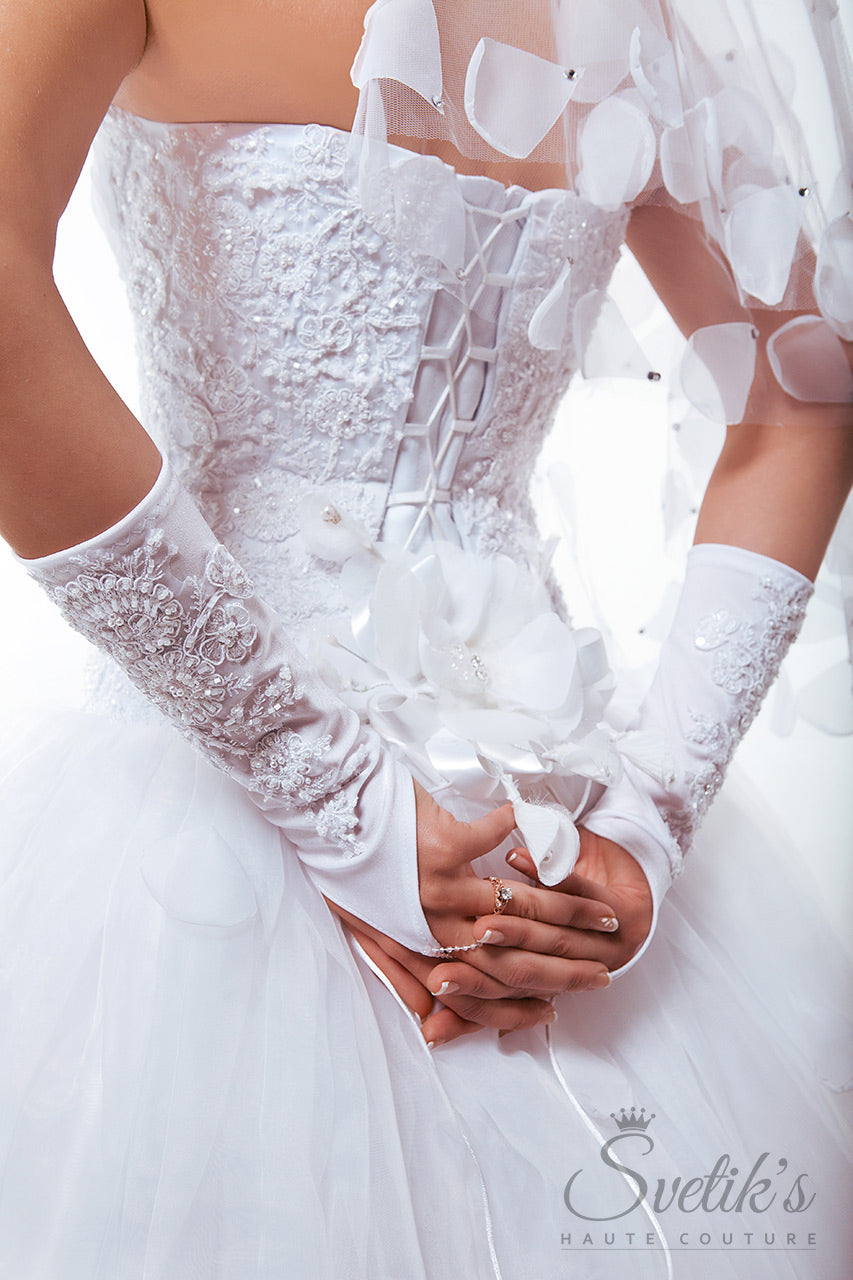 Matching embroidered gloves and a stunning hand-crafted veil with silk petal embellishment add the final touches to this enchanting work of art, the Edelweiss gown.