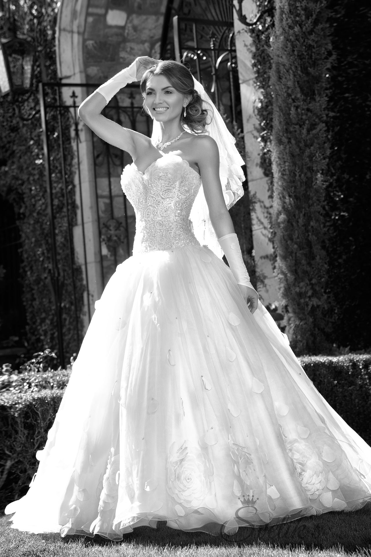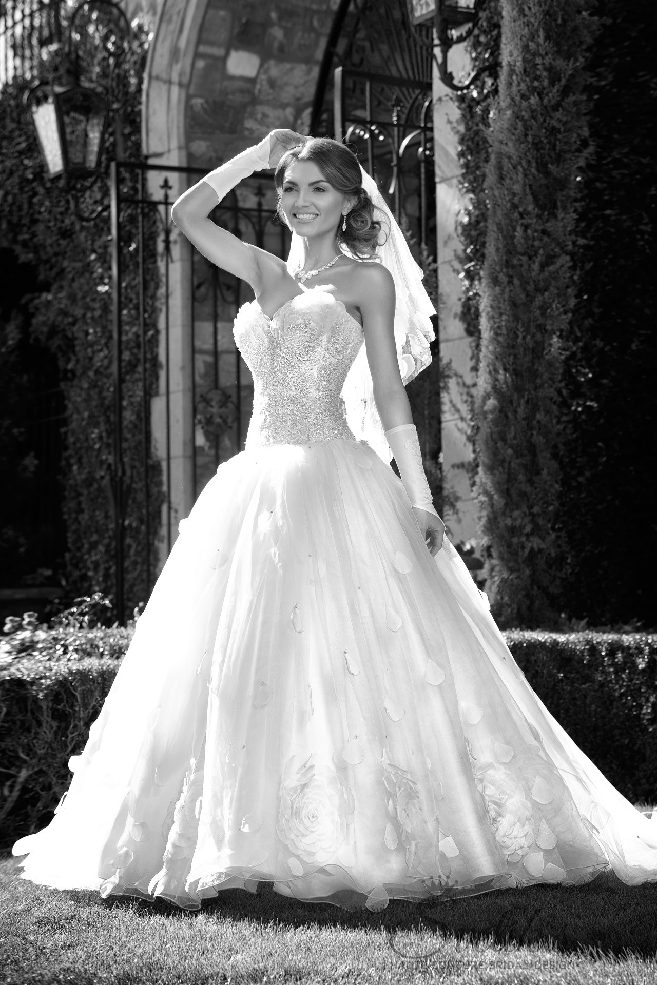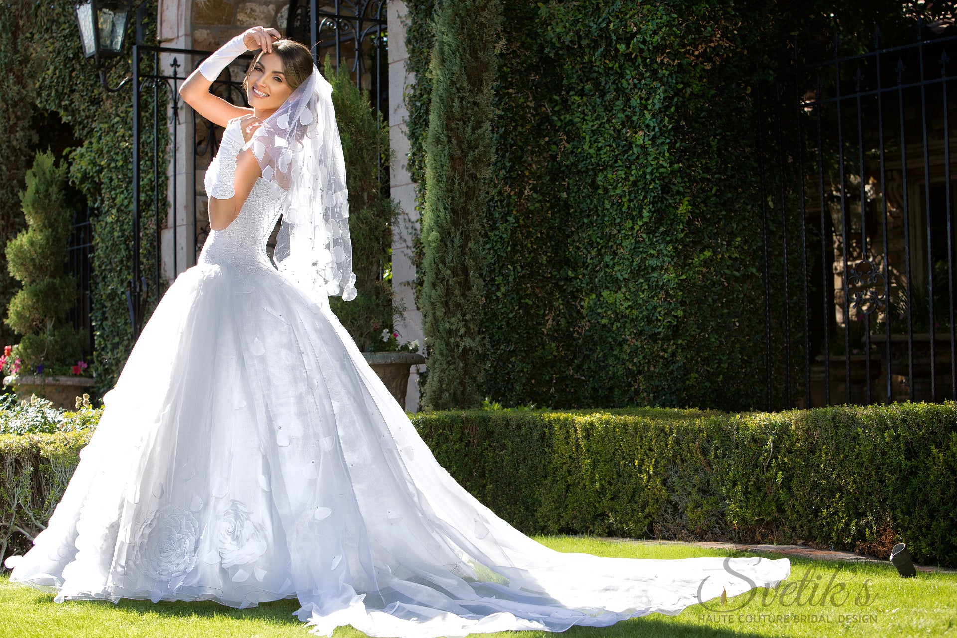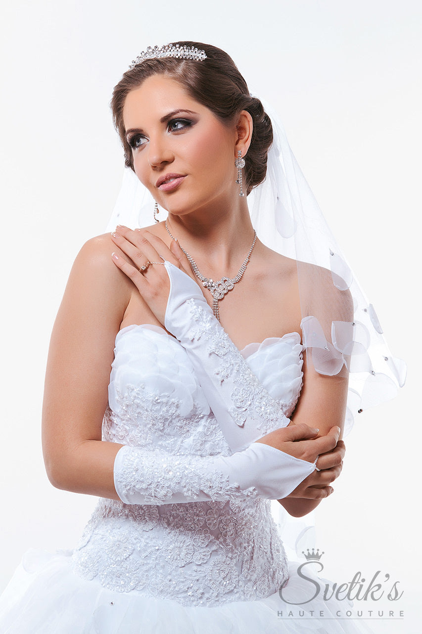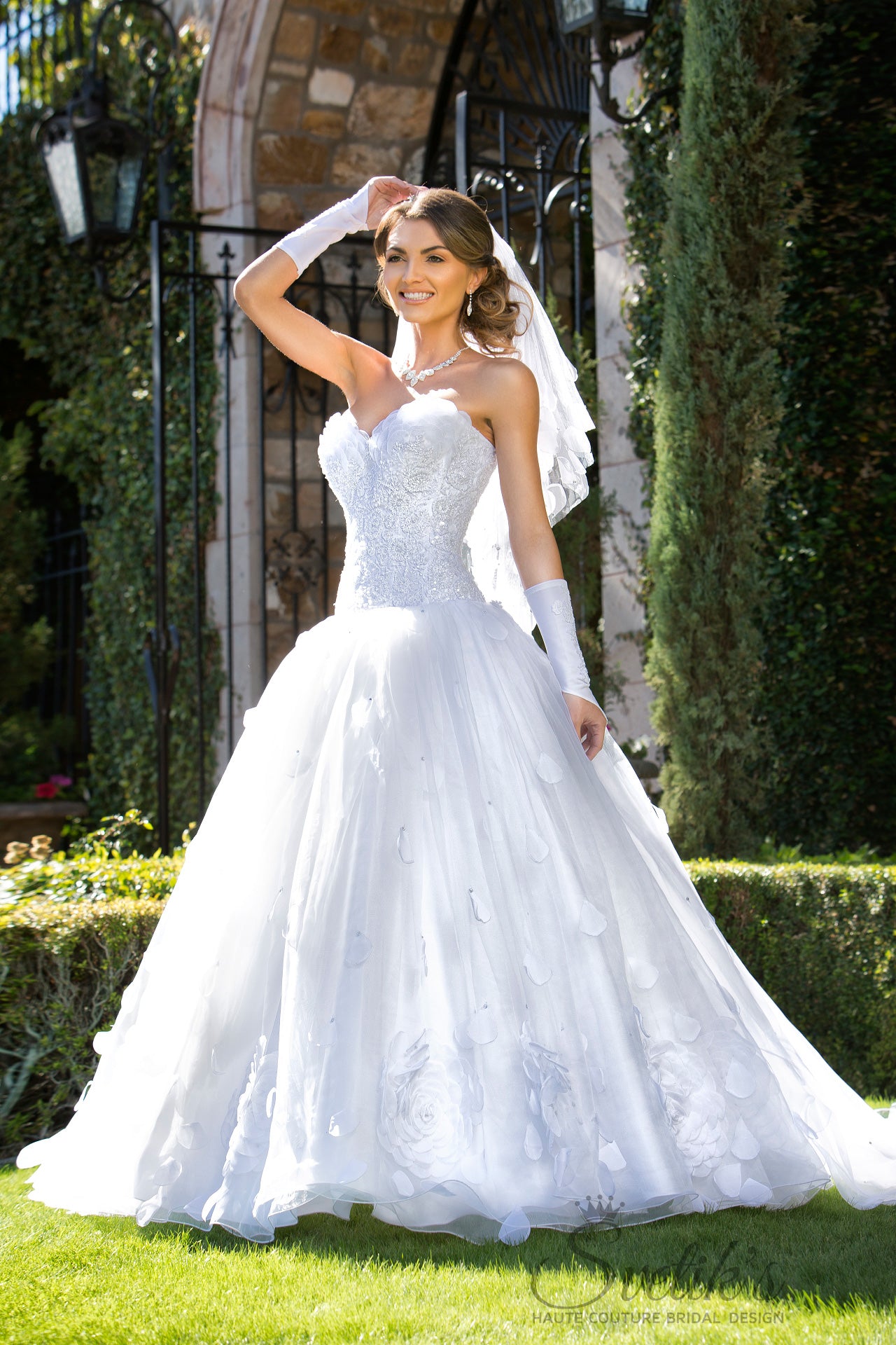 Matching embroidered gloves and a stunning hand-crafted veil with silk petal embellishment add the final touches to this enchanting work of art, the Edelweiss gown.