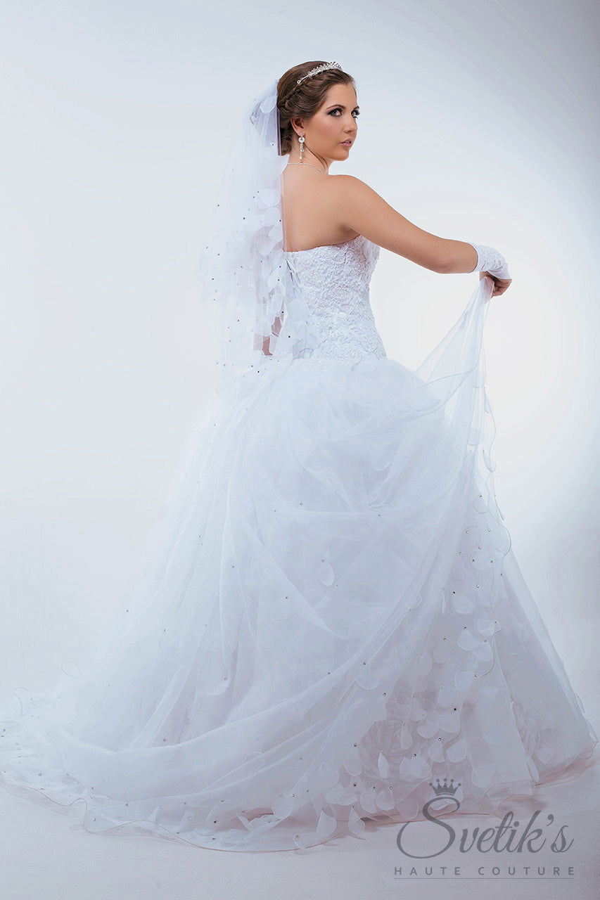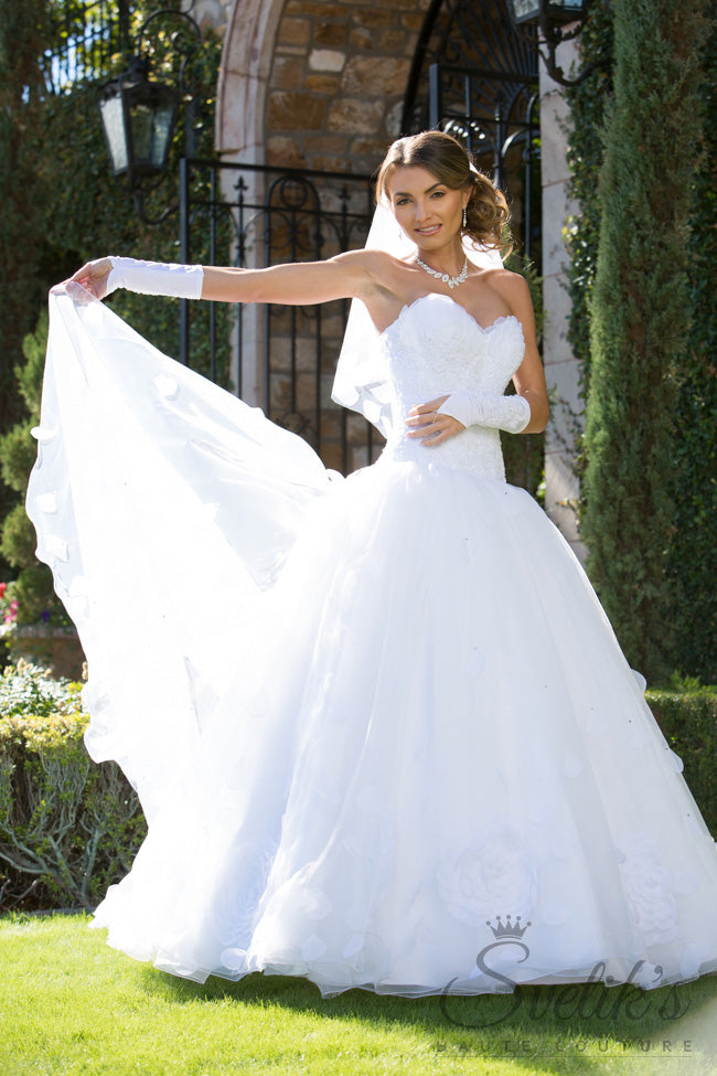 The grandeur of a magnificent 90” detachable train is off-set by the delicately trimmed sweetheart bodice, edged in tulle petals and covered in intricate embroidered lace applique, hand beaded and sparkling with a dusting of Swarovski crystals.