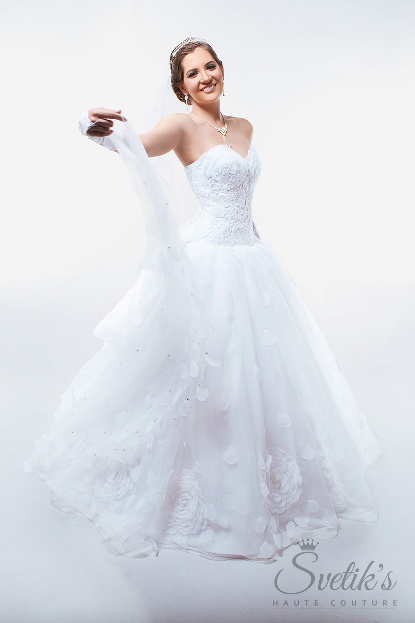 A whimsically romantic, layered ball gown skirt features cascading silk flower petals falling gently to the hem, edged with oversized embroidered White Edelweiss flowers.
